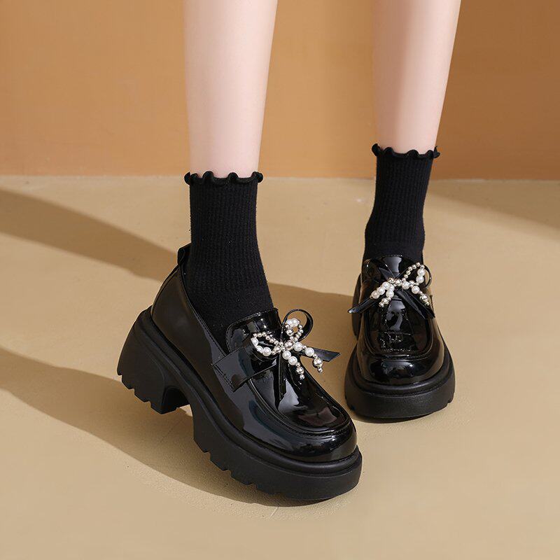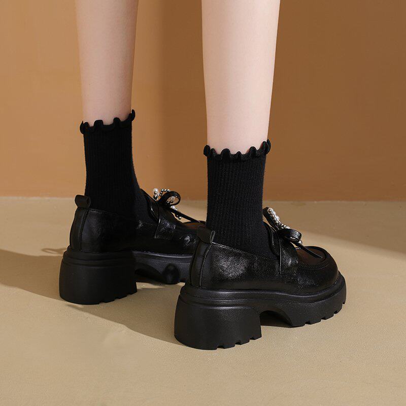 女2025秋季 34码 新款 配裙子蝴蝶结单鞋 英伦风黑色小皮鞋 厚底乐福鞋