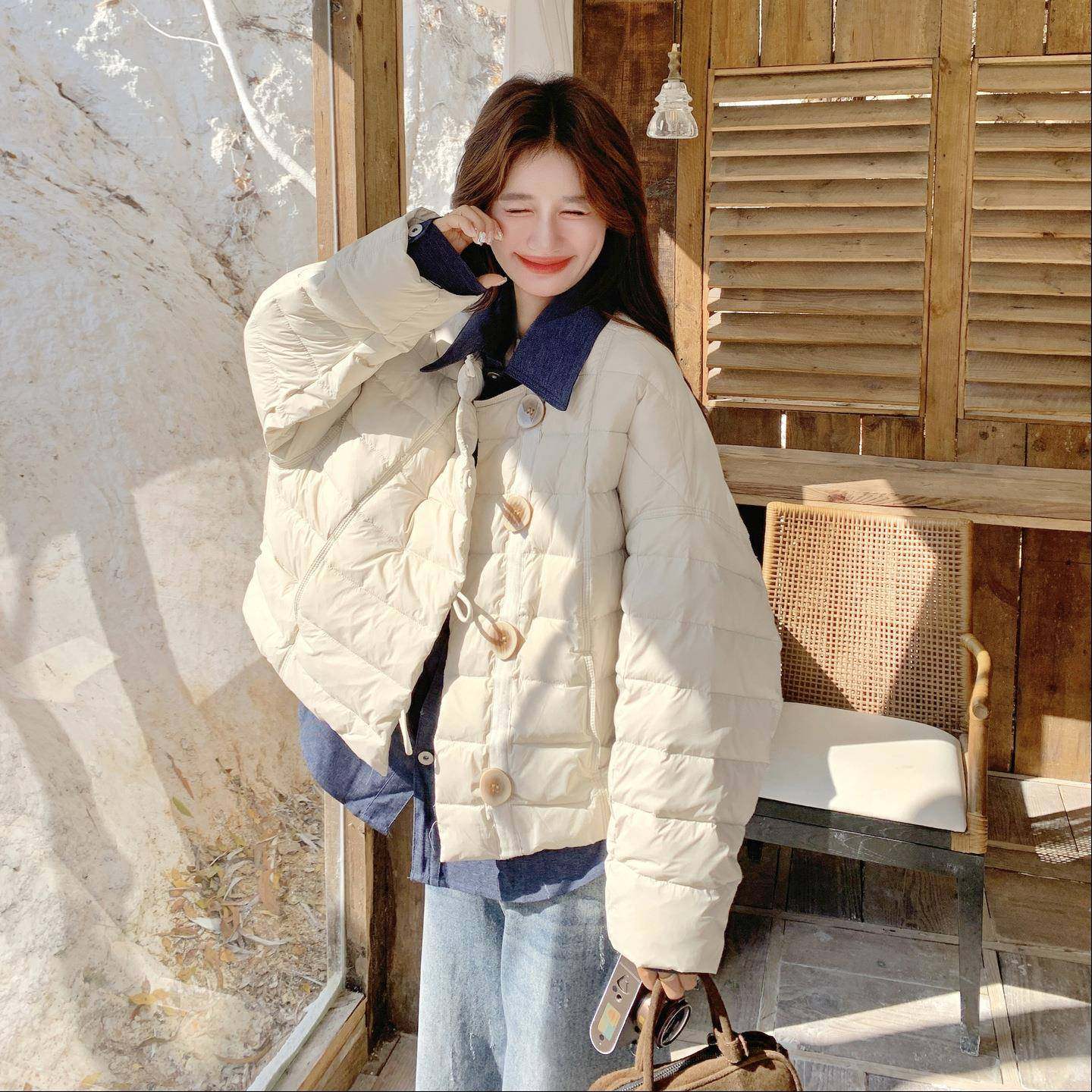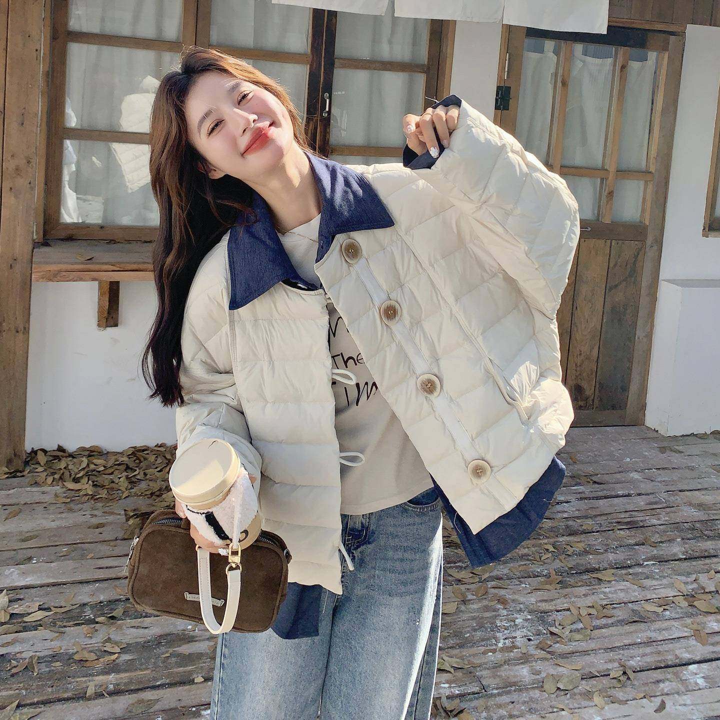 米色假两白件撞色拼排骨羽绒服级冬季 927加厚 韩系高感翻接领B271