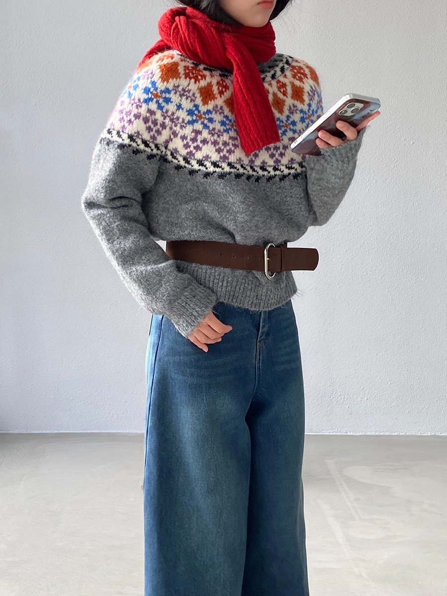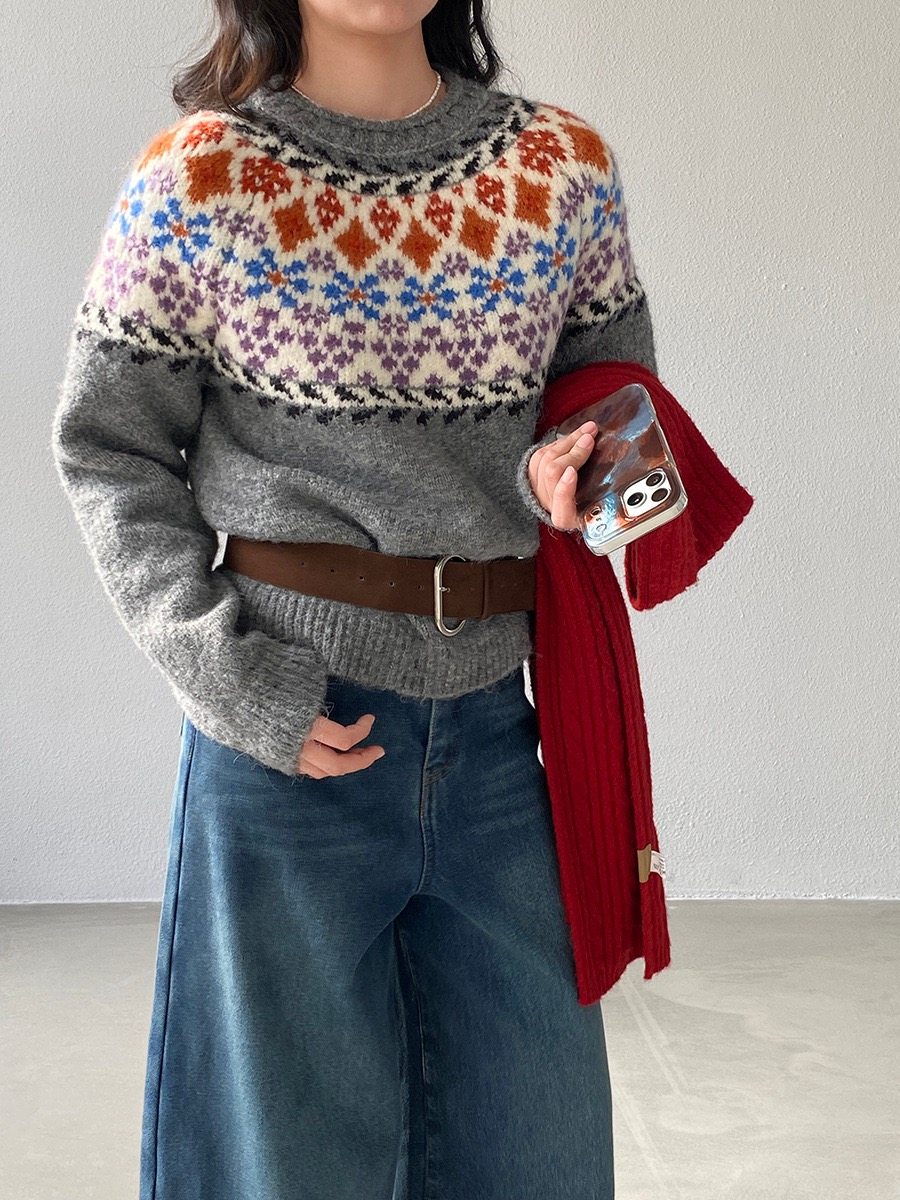 U1441 新款 江左 复古小碎花费尔岛宽松圆领套头毛衣女加厚25冬季