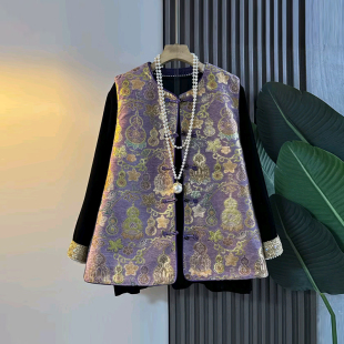 口小衫 气质显瘦拼色袖 女装 胖MM洋气葫芦花纹盘扣国风马甲加肥大码