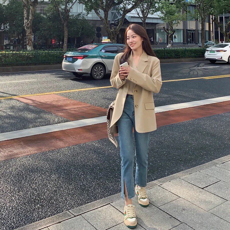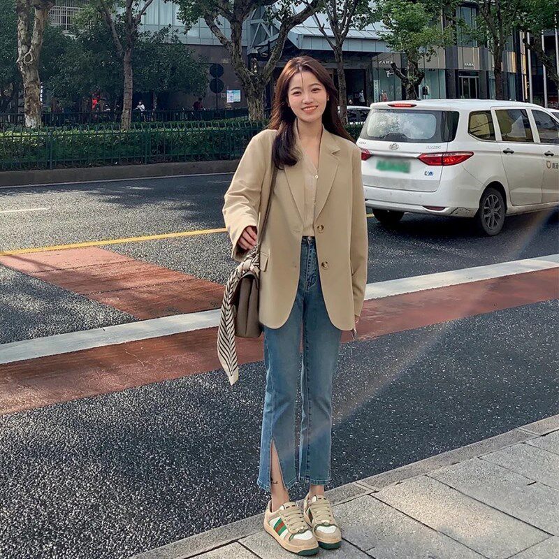 韩版 新款 小个子宽松显瘦休闲西服 外套女2023春季 高级感卡其色西装