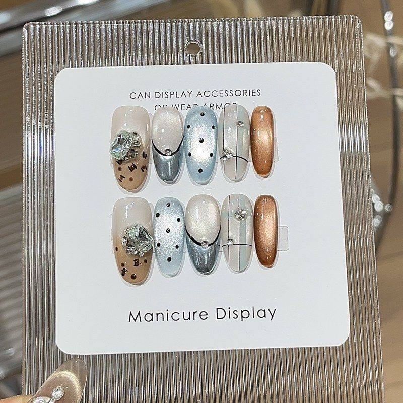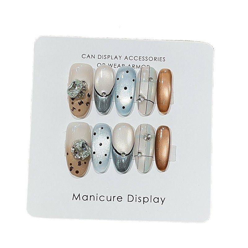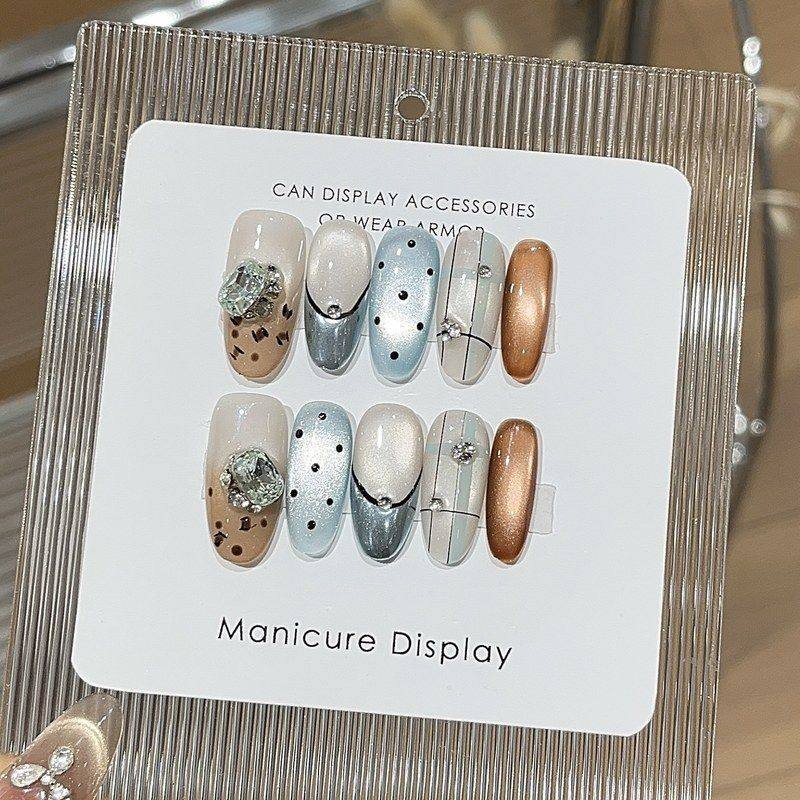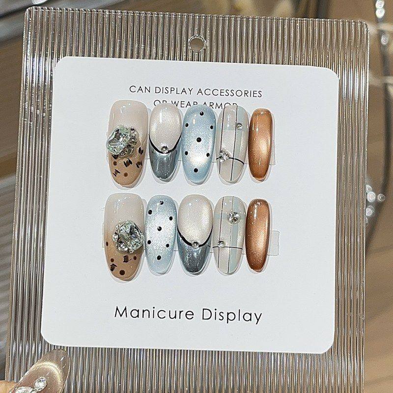 纯手工桃汽蓝调清冷蓝棕玻璃珠波点猫眼格纹碎钻日常窄椭圆穿戴甲