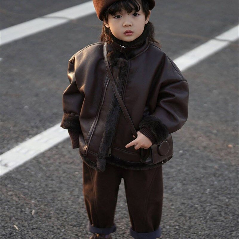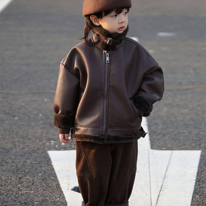 砚台家儿童冬装 男童立领皮夹克宝宝加绒外套中小童男孩皮衣加厚潮