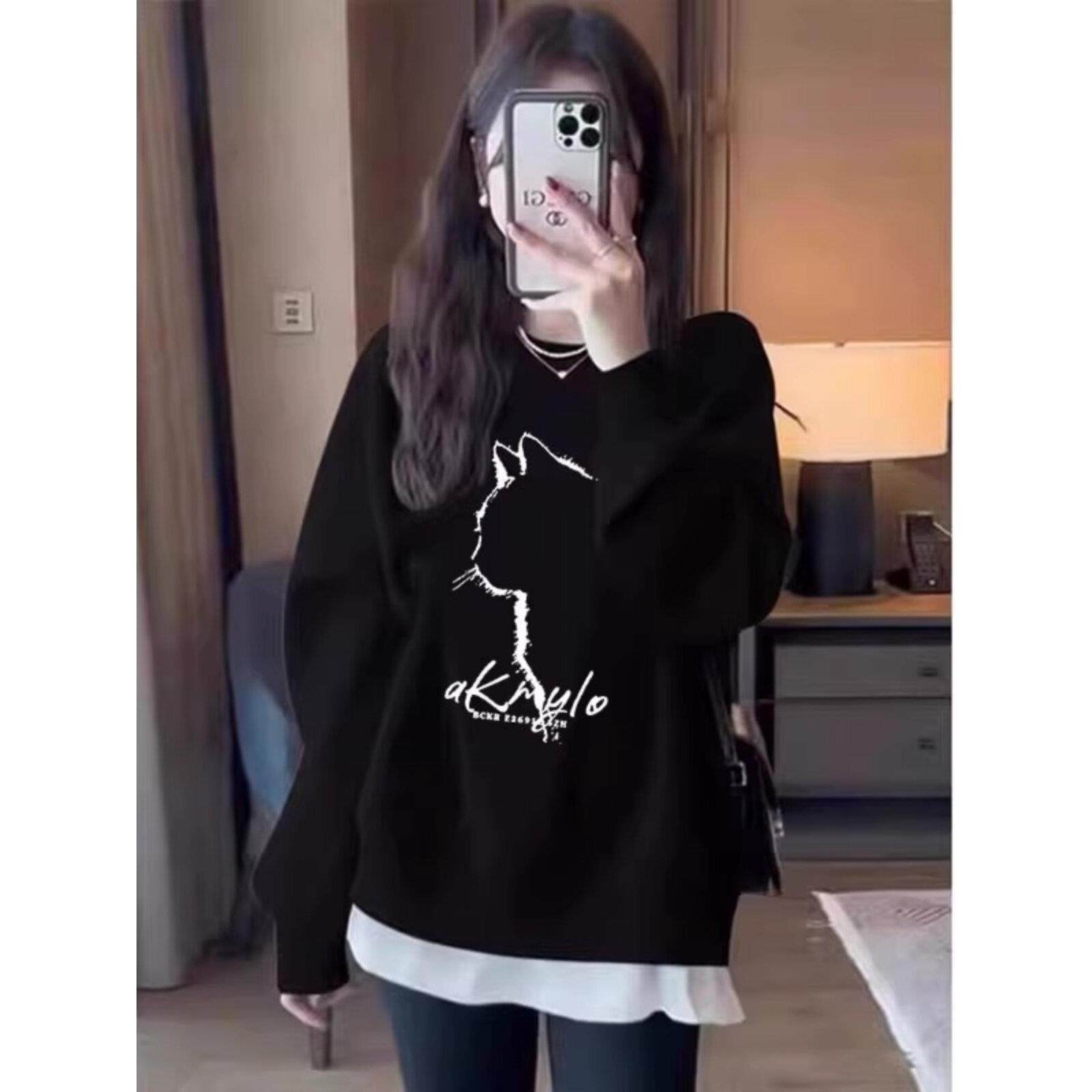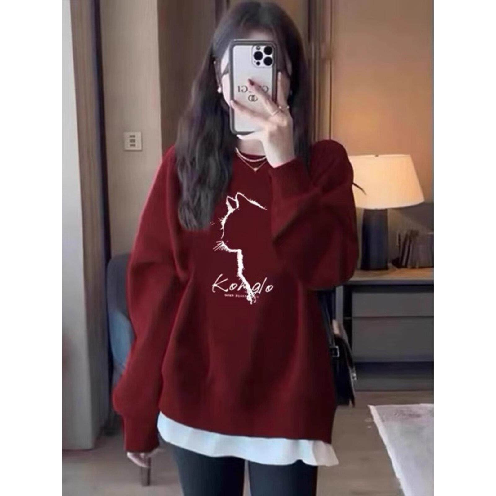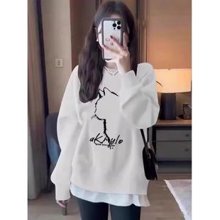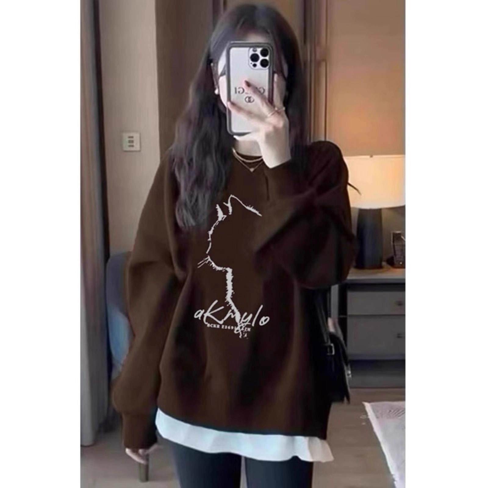小个子穿搭宽松休闲套头上衣 新款 假两件咖色圆领卫衣女款 2025秋季