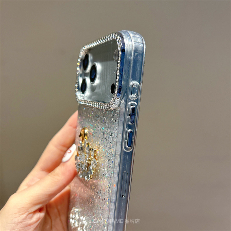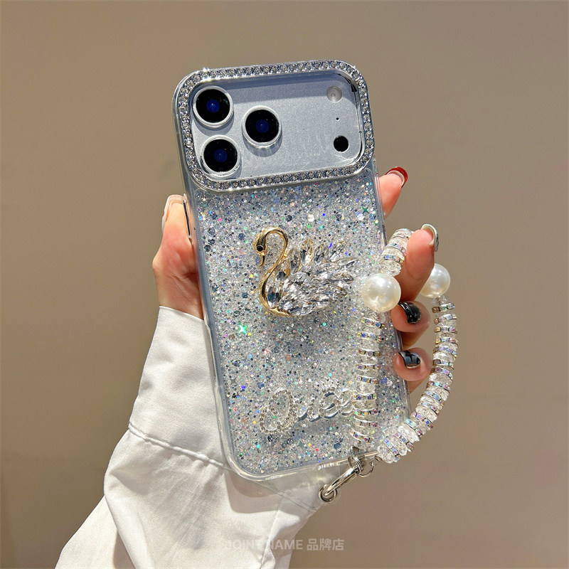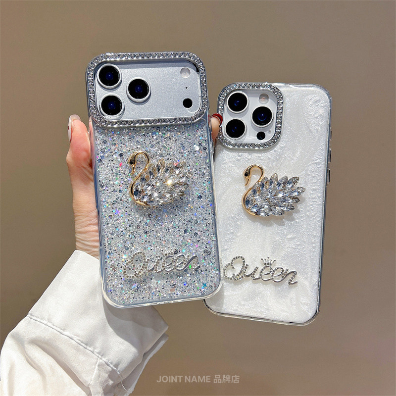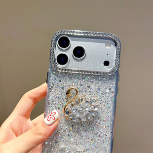 适用苹果17ProMax手机壳iPhone15保护套镶钻立体天鹅16闪钻石14Plus贝壳13闪钻相机框12时尚 Case 白色小众Air