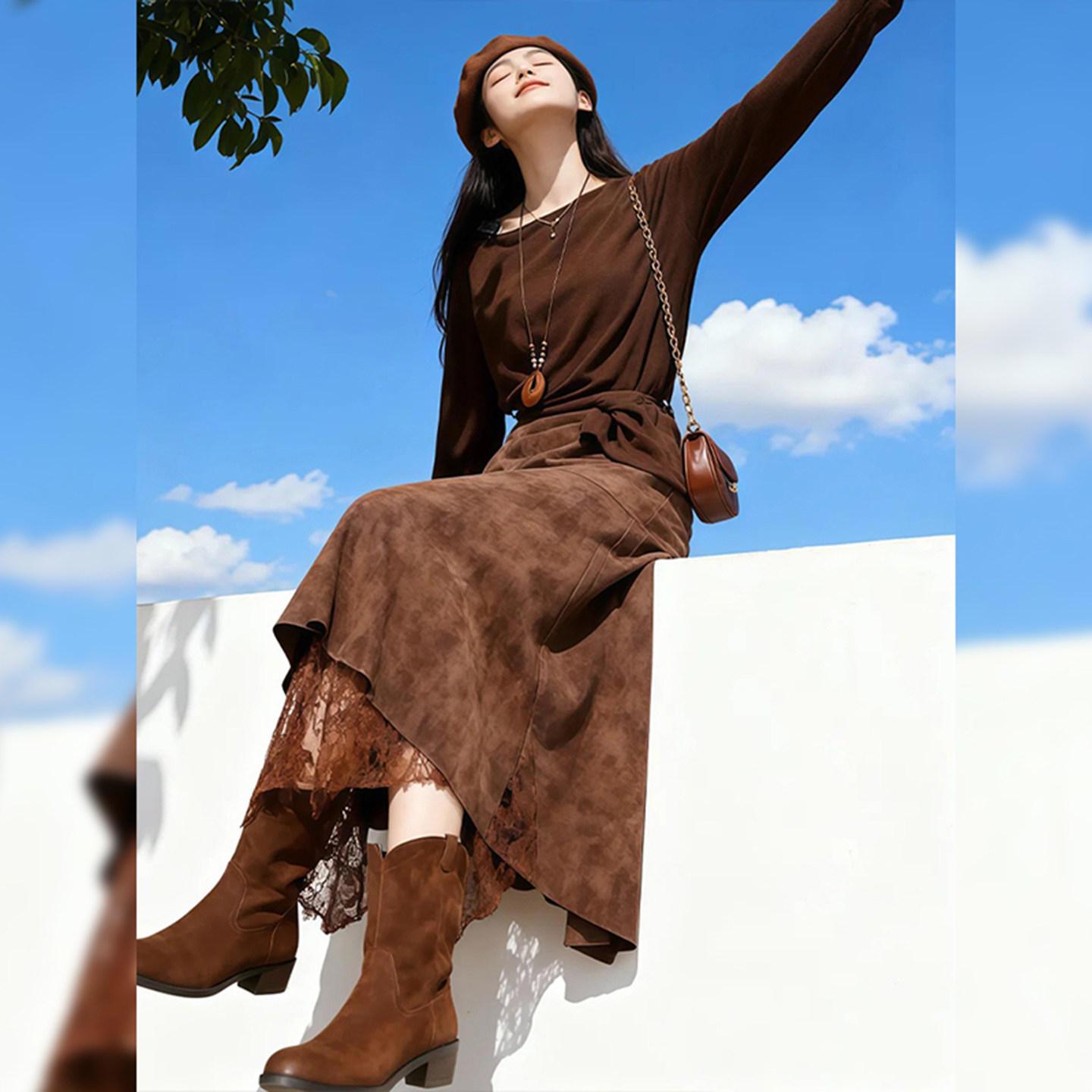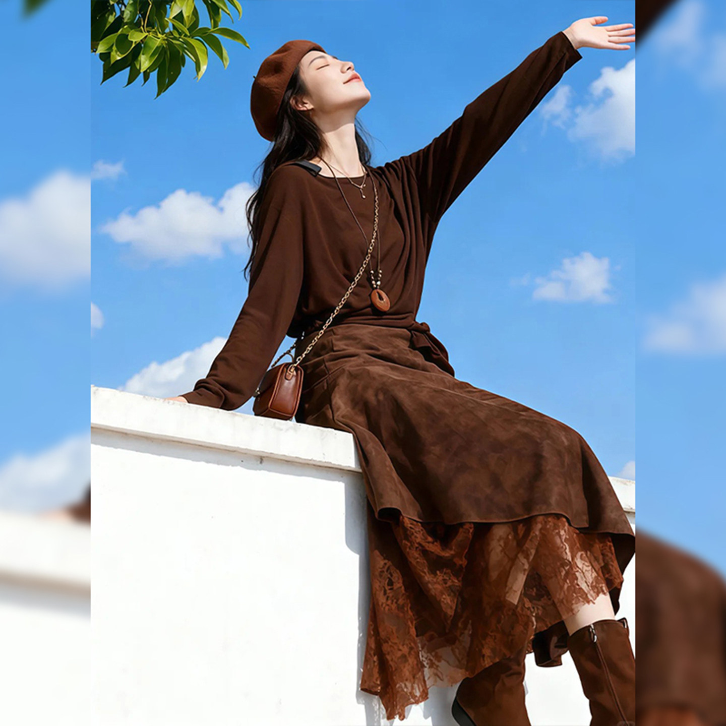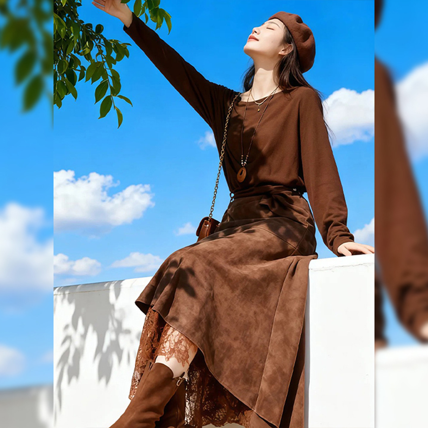 咖色长裙 内搭设计感小众修身 不规则蕾丝拼接长袖 连衣裙子女秋冬季