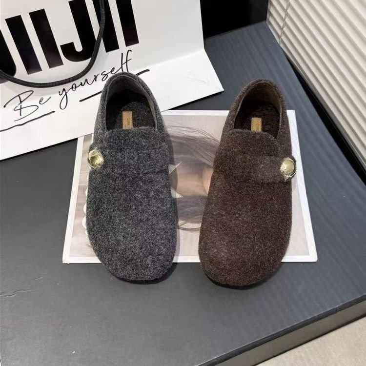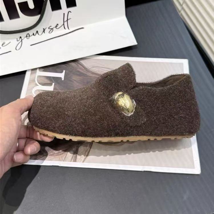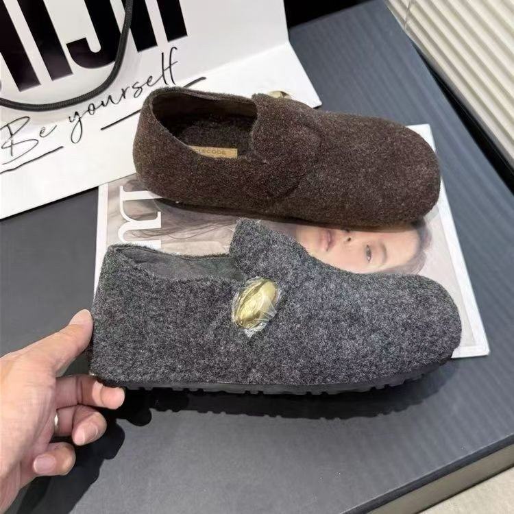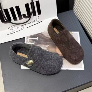 2025年秋冬加绒保暖毛呢圆头内豆豆乐福鞋 复古丑萌勃肯鞋 子女瓢鞋