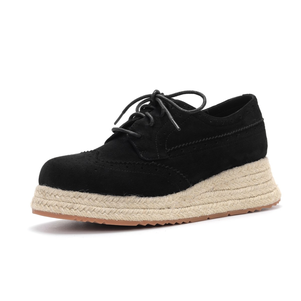 女鞋 百搭小个子增高单鞋 女黑色系带草编渔夫鞋 英伦风厚底松糕鞋