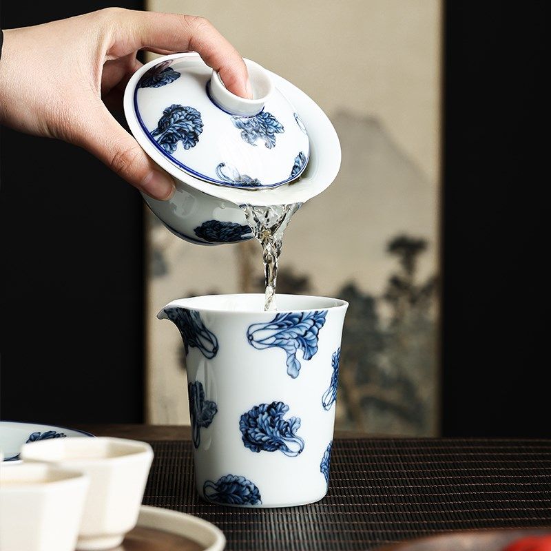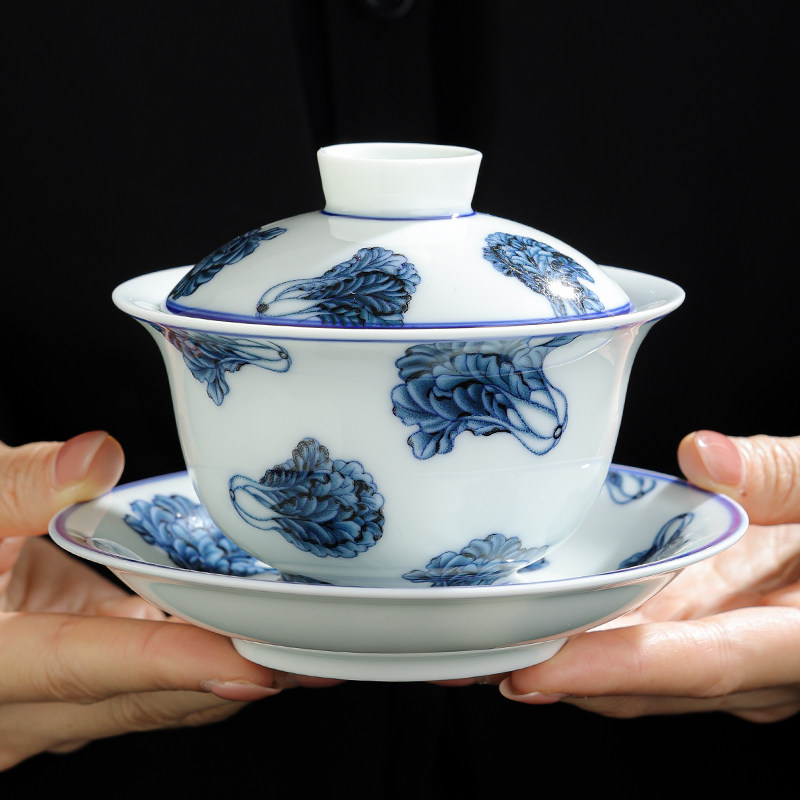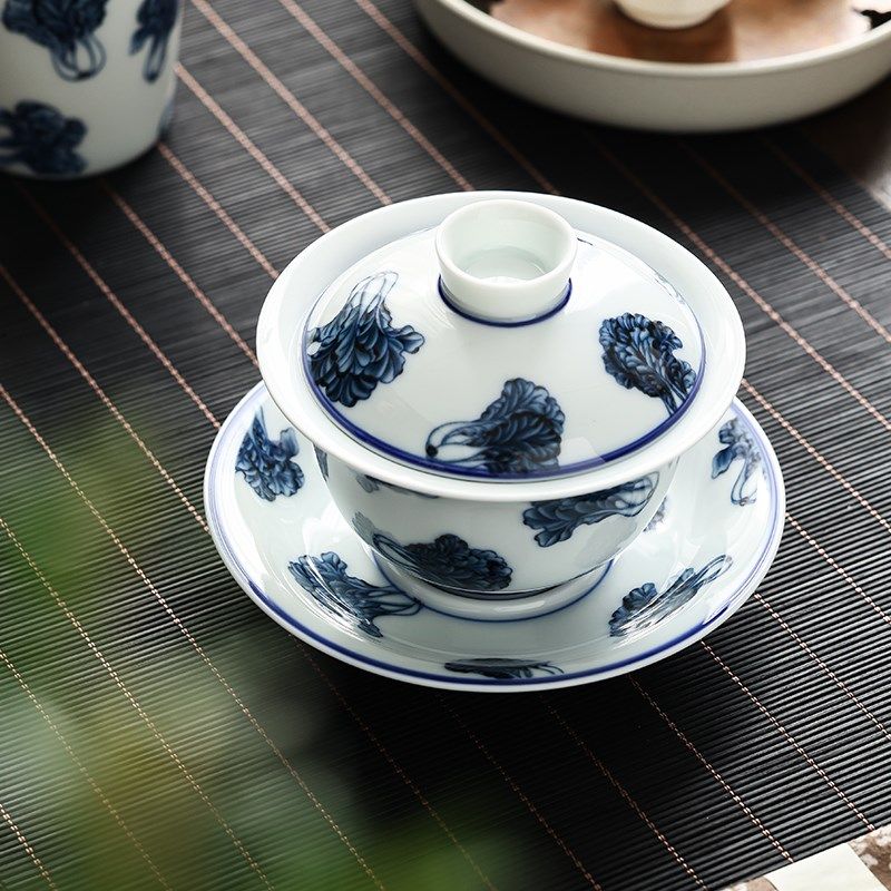 青花盖碗茶杯特价 功夫茶具三才茶碗家用陶瓷手绘高档大泡茶壶悬停