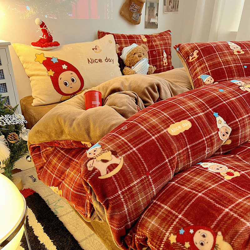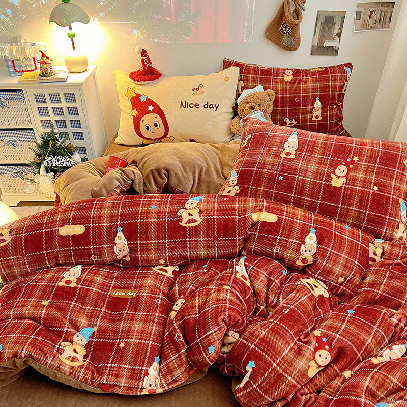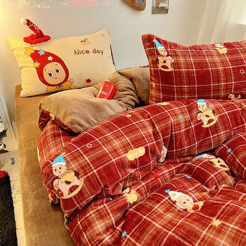 秋冬保暖卡通牛奶绒四件套双面绒法兰绒被套学生3件套加绒床单