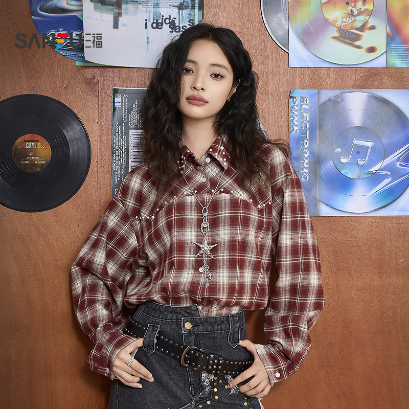 饰翻领衬衣宽松休闲上衣女装 珠珠装 515256 2026春新款 三福格子衬衫