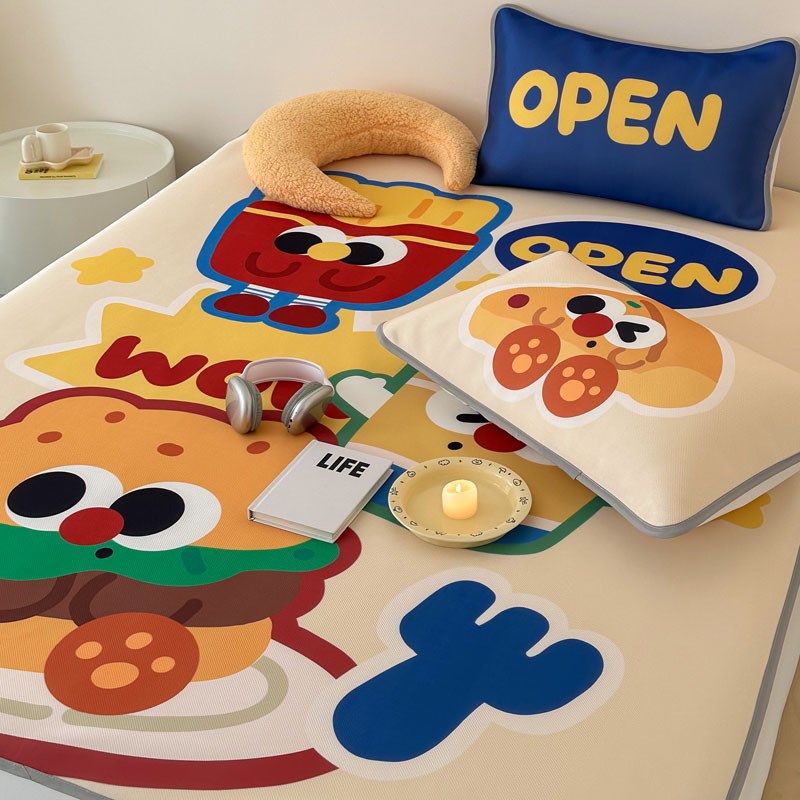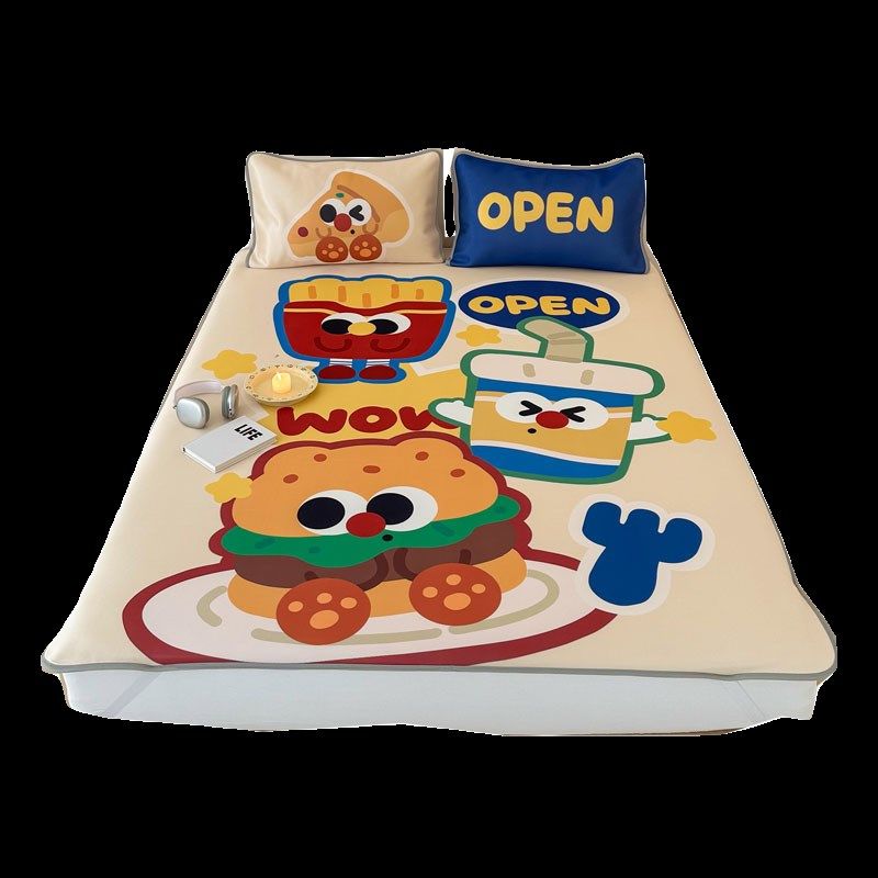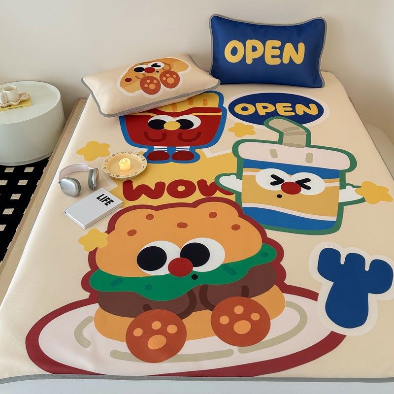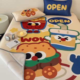 卡通汉堡新款 碳光凉感冰丝凉席三件套少女心裸睡空调软席宿舍凉席
