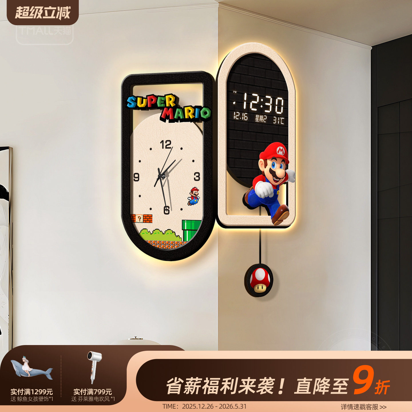 钟表挂钟客厅家用时尚 双万年日历现代时钟挂墙事事如意静音电子钟
