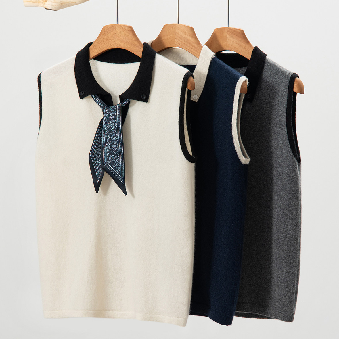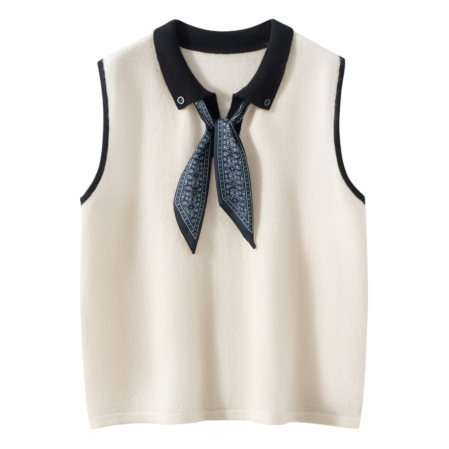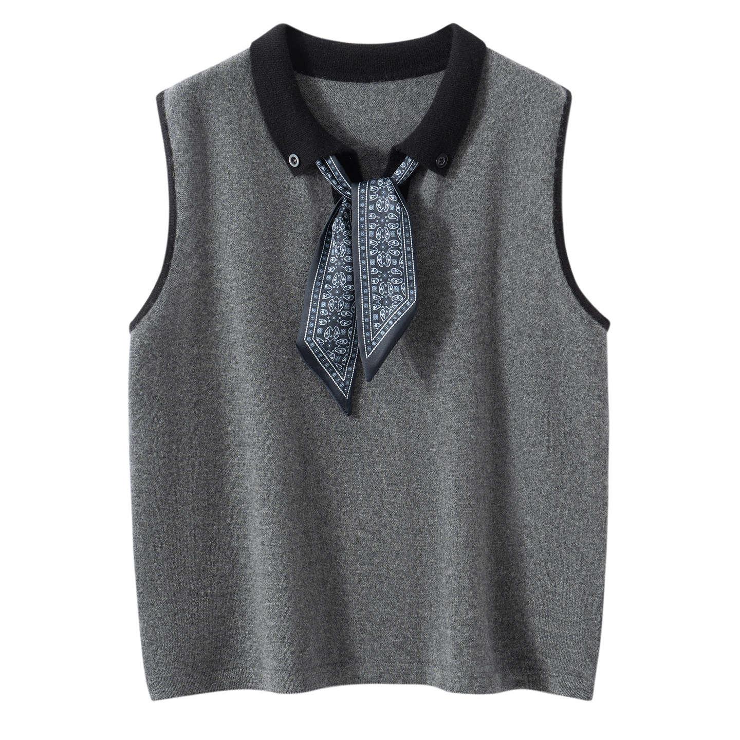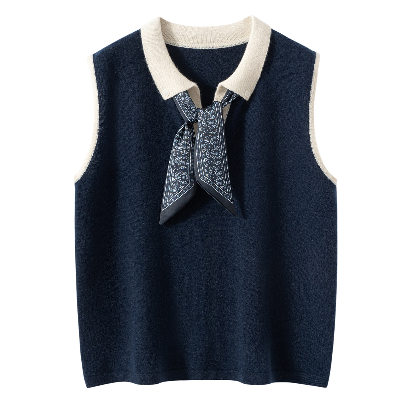 百搭 丝巾飘带半开翻领背心时尚 2025秋冬新款 100%纯山羊绒女设计款