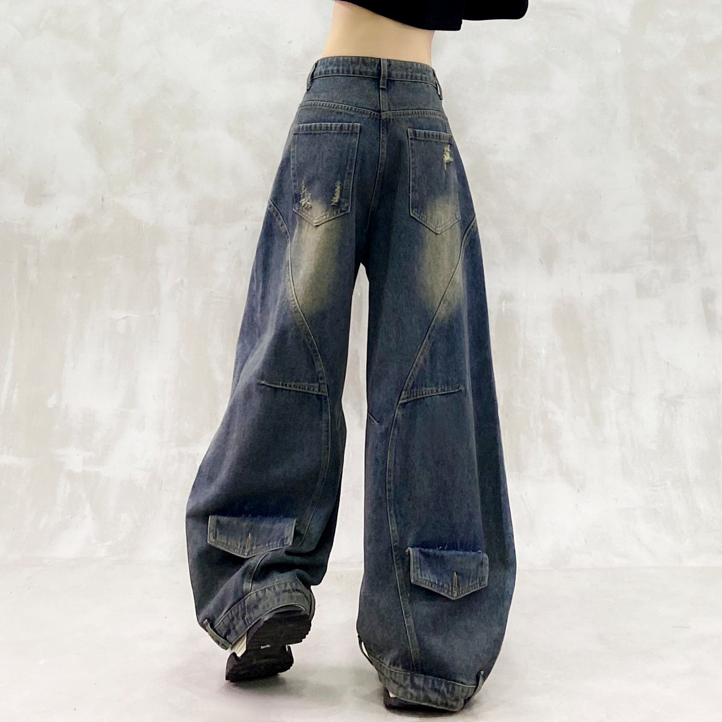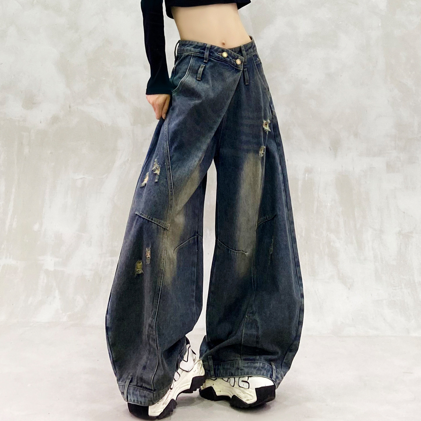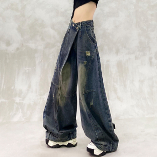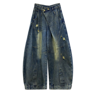 子 高腰宽松显瘦百搭香蕉裤 设计感拼接磨破复古弯刀牛仔裤 女春新款