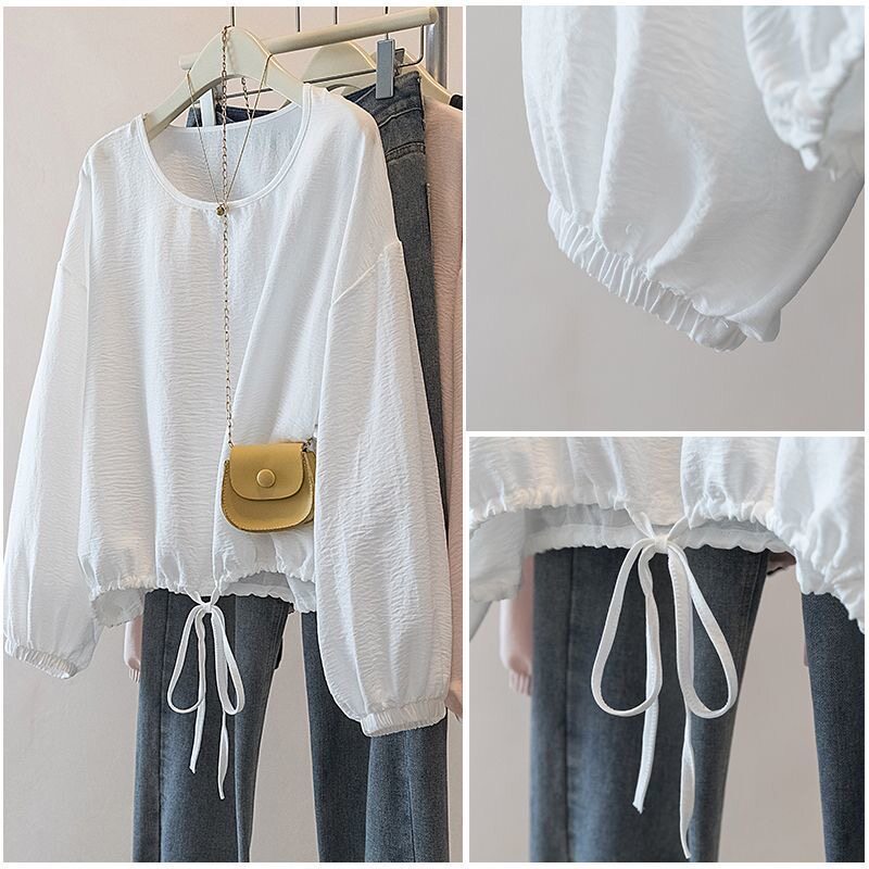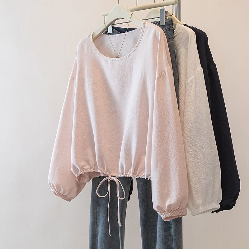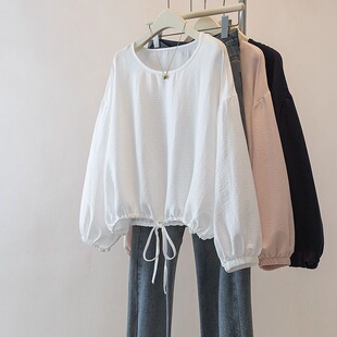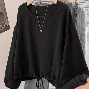 特大码 女胖mm宽松显瘦纯色慵懒上衣 300斤设计感抽绳收腰长T恤衫