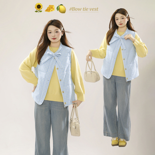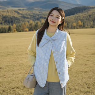 保暖叠穿百搭蓝白格纹棉服马甲 微胖mm秋季 DM100大码 百分百女装