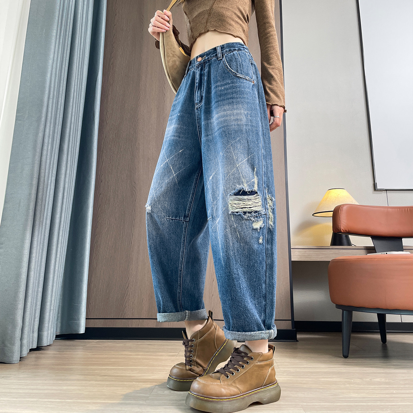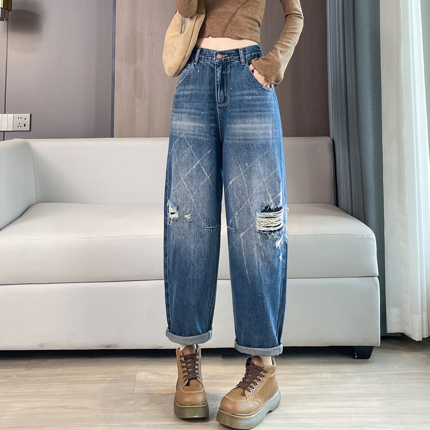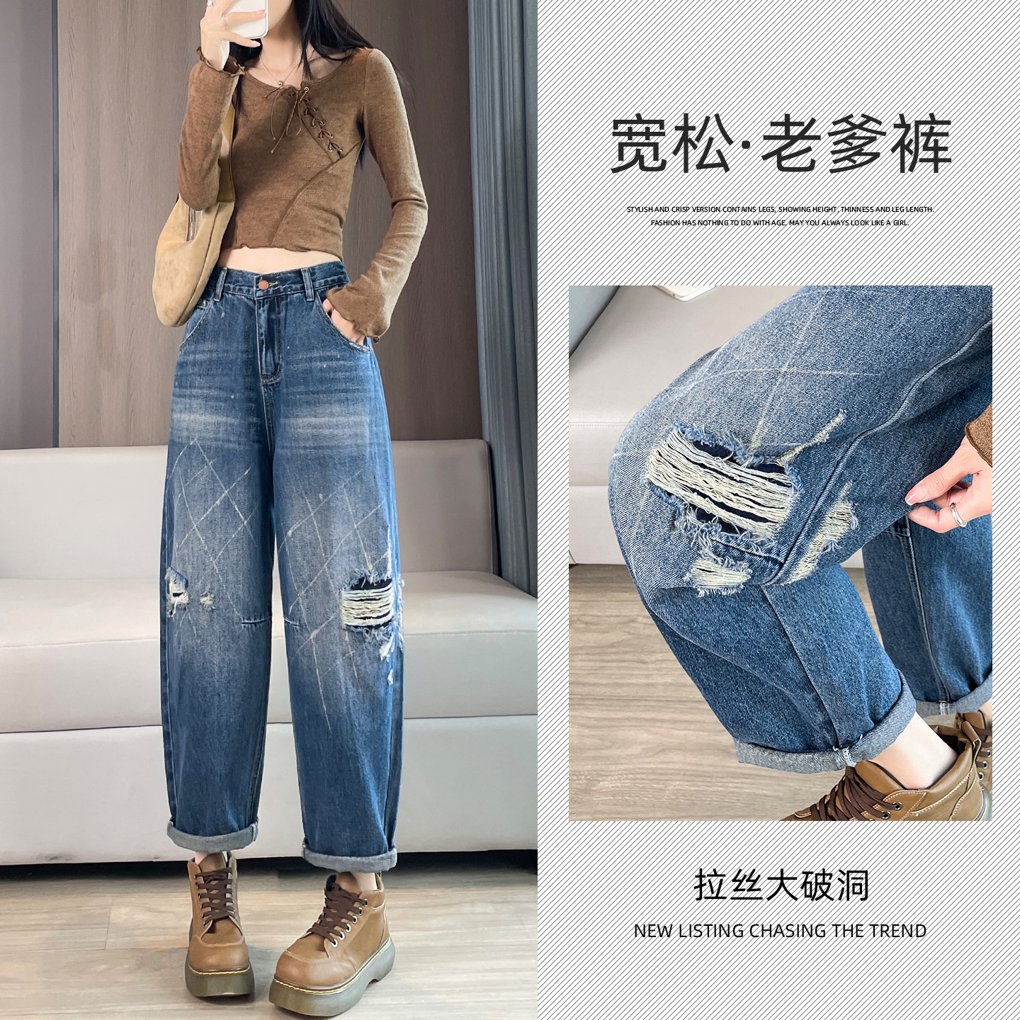 高腰宽松显瘦小个子九分萝卜老爹裤 破洞哈伦牛仔裤 女2026春秋新款