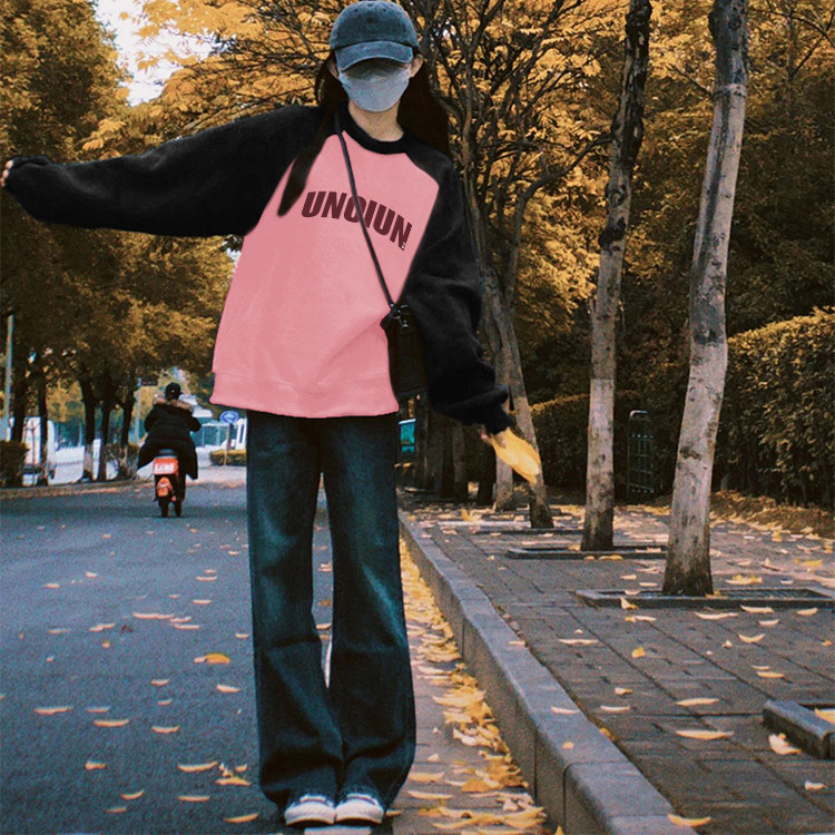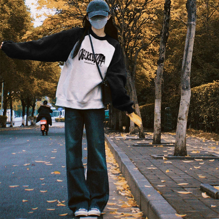 纯棉美式 宽松oversize小个子慵懒风外套 复古插肩圆领卫衣女春秋款