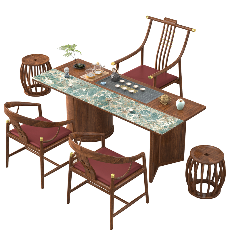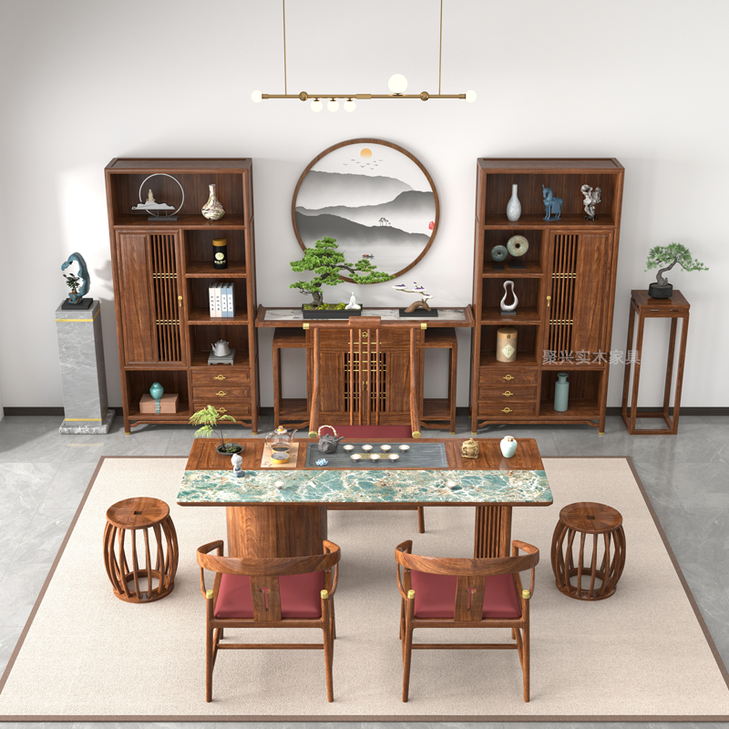 新中式 一体家用办公室原木茶台 乌金木茶桌椅组合实木茶几茶具套装