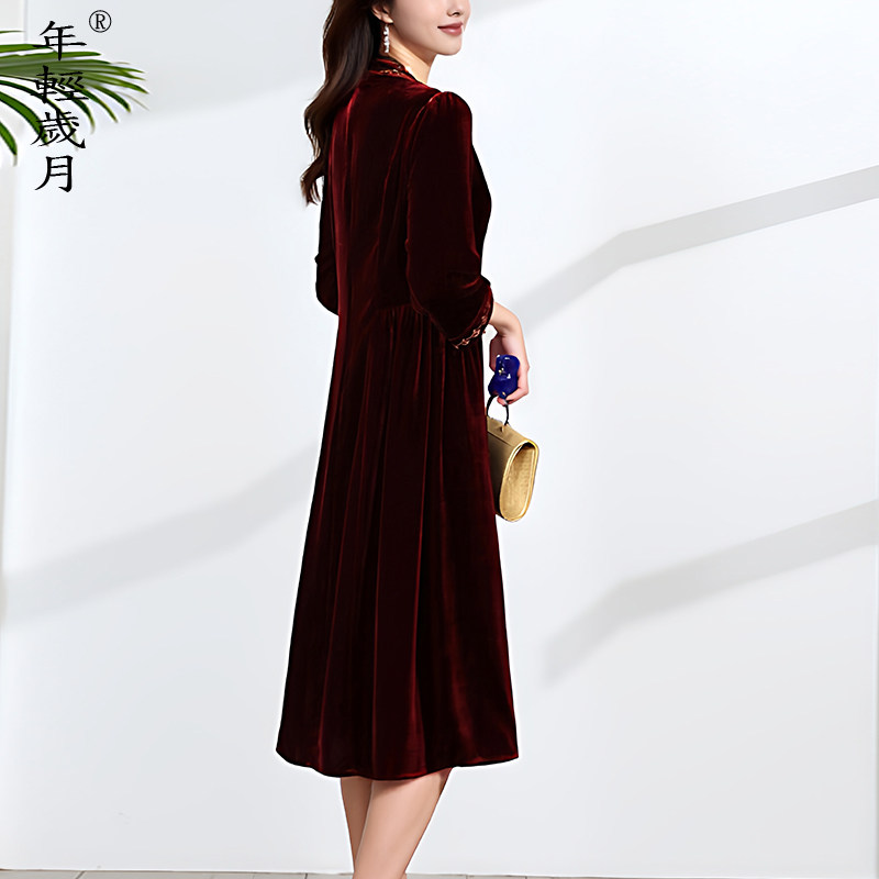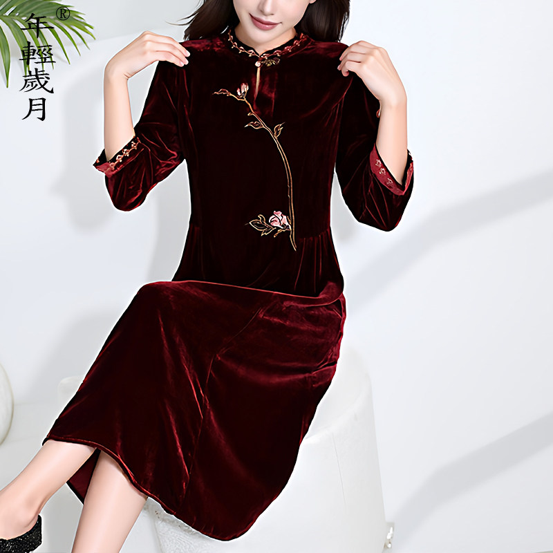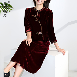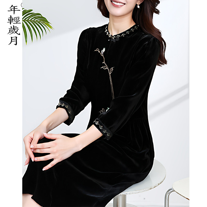 刺绣桑蚕丝裙子 中国风喜婆婆新中式 真丝丝绒连衣裙女2026春季 新款