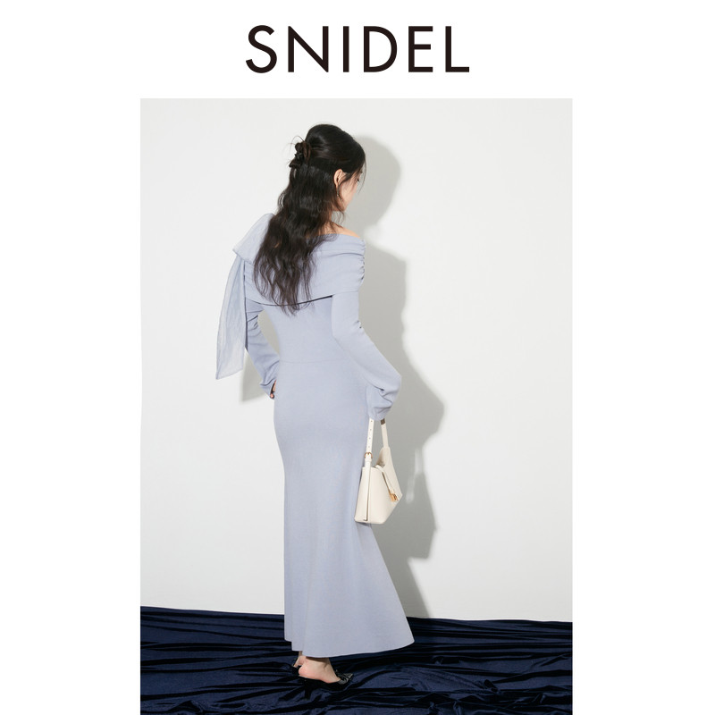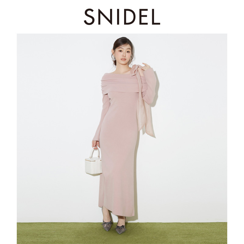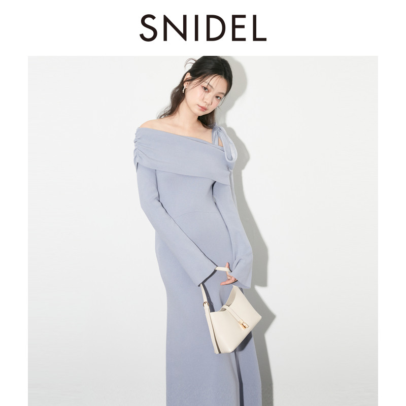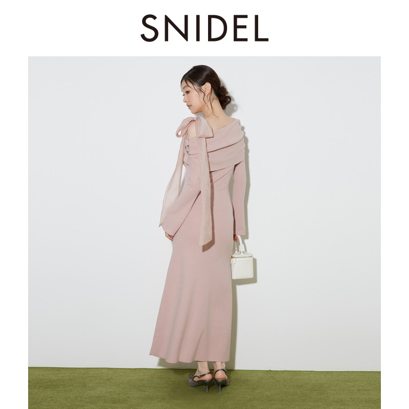 SNIDEL2025秋冬新品 针织连衣裙SWNO254320 优雅斜肩蝴蝶结肩带长袖