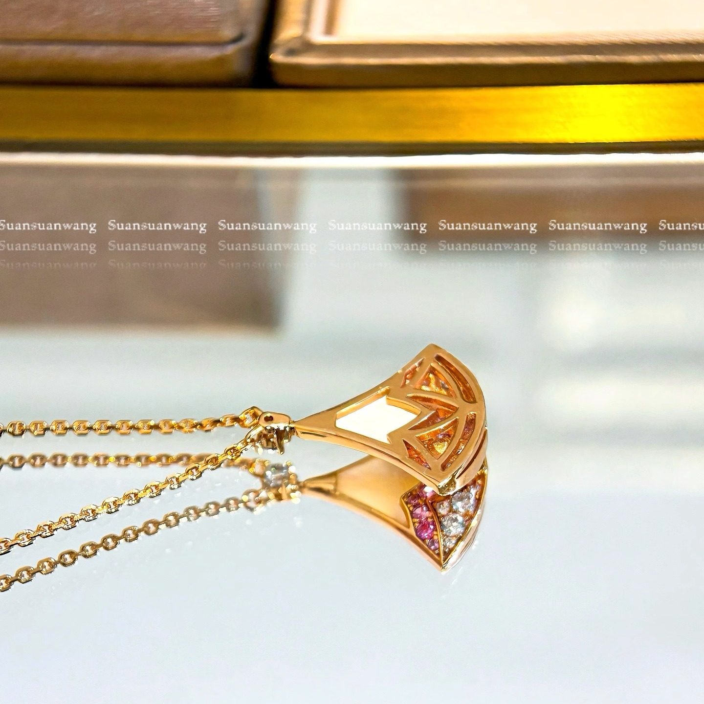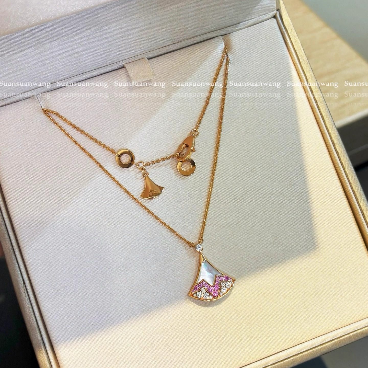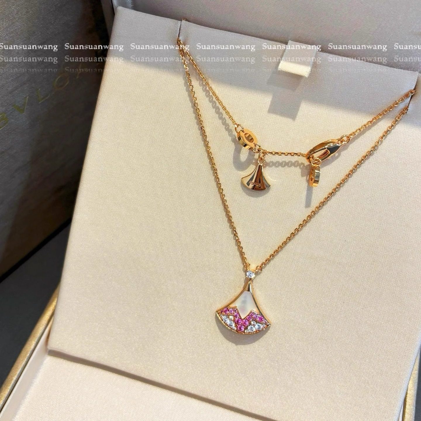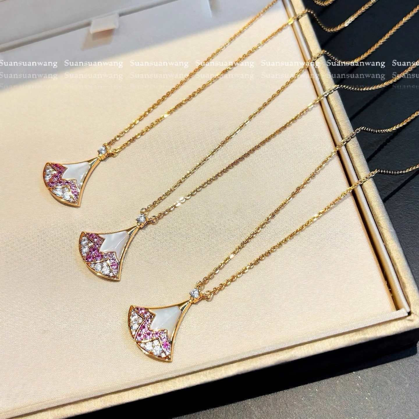 绝美新款 白贝母玫瑰金粉色镶钻扇形小裙子吊坠项链银厚镀18k
