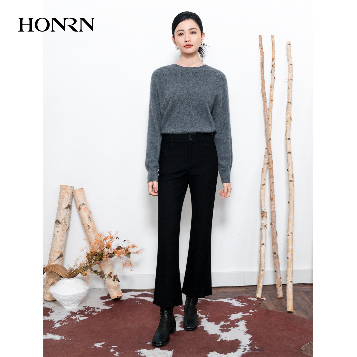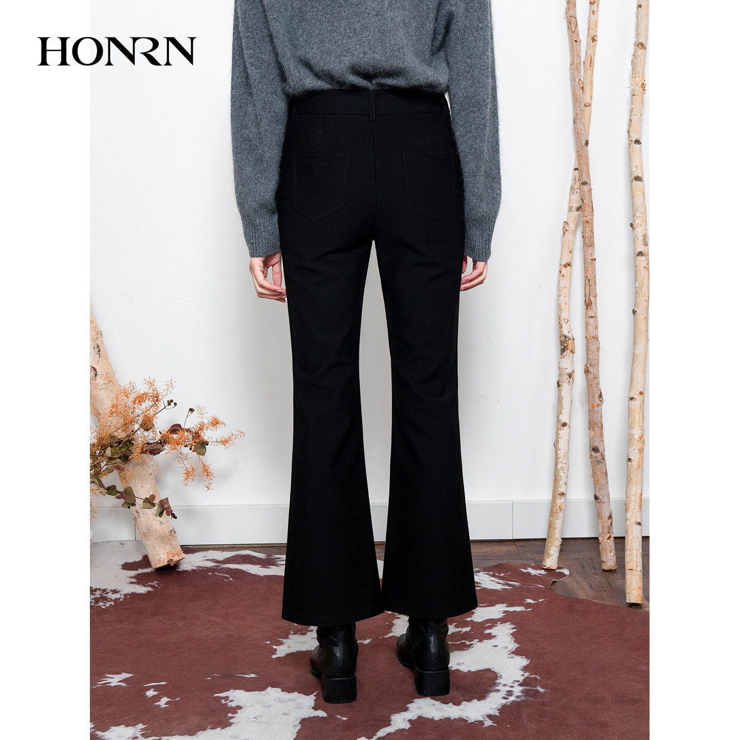 显瘦微喇叭休闲裤 子修身 女秋冬HI55OK155 红人气质黑色长裤 HONRN