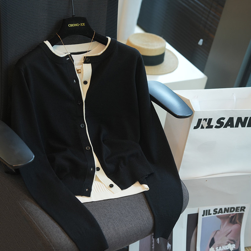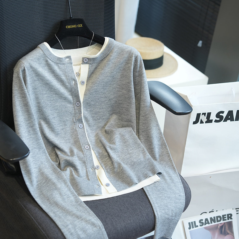 A51B 女毛衣外套秋季 虫小小2025绵羊毛混纺圆领假两件长袖 针织开衫