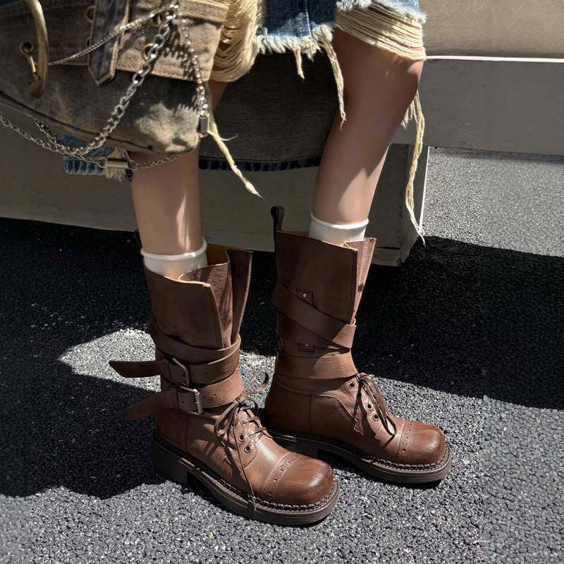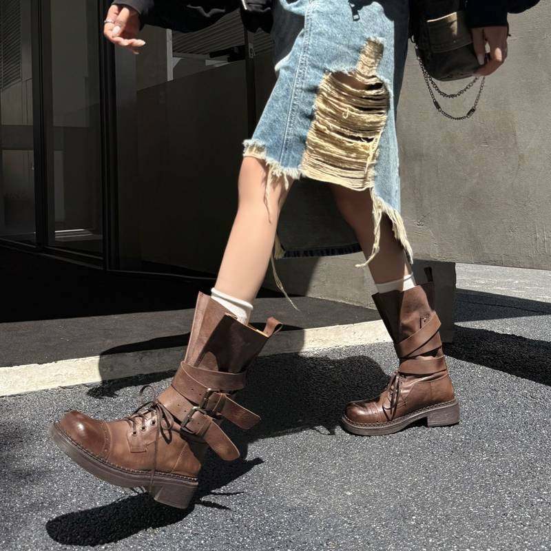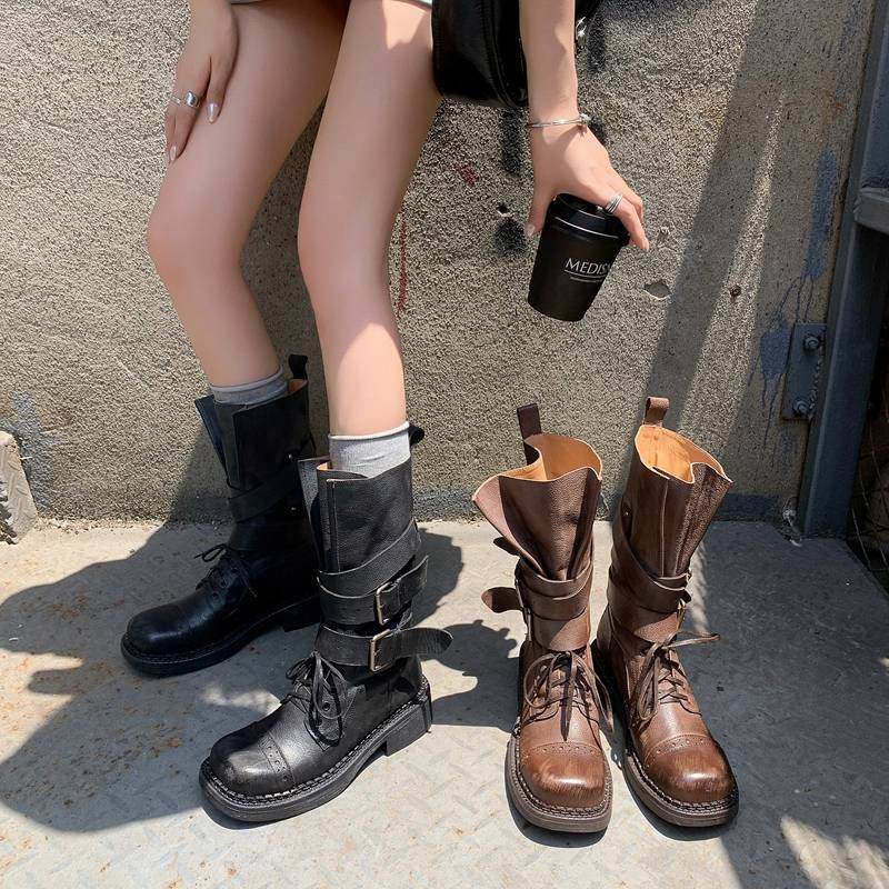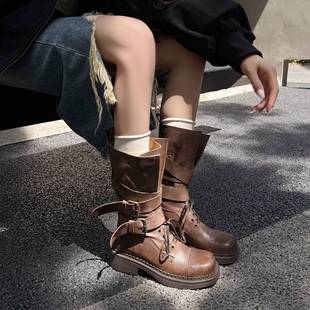 不过膝长筒靴女小个子女鞋 复古黑色马丁厚底高筒骑士靴子显瘦长靴
