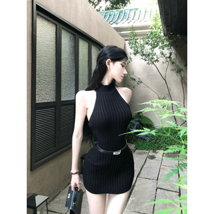 灰尘邓邓 性感露背包臀裙纯欲裙子 针织挂脖连衣裙女2025秋冬新款