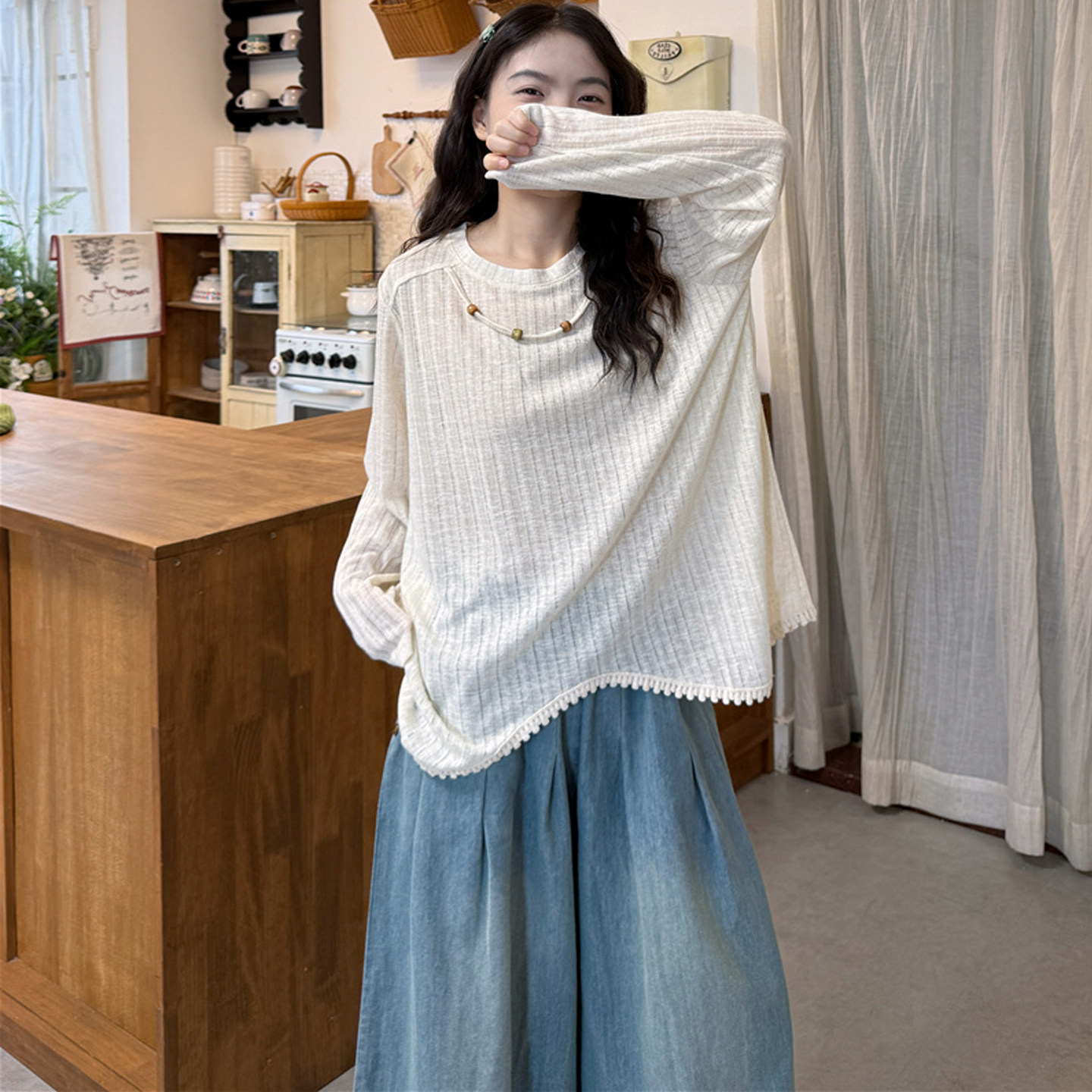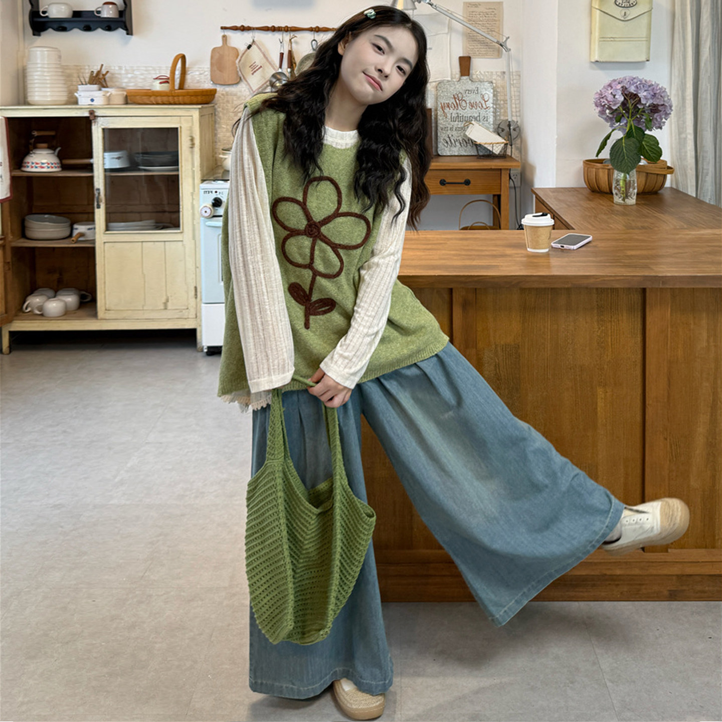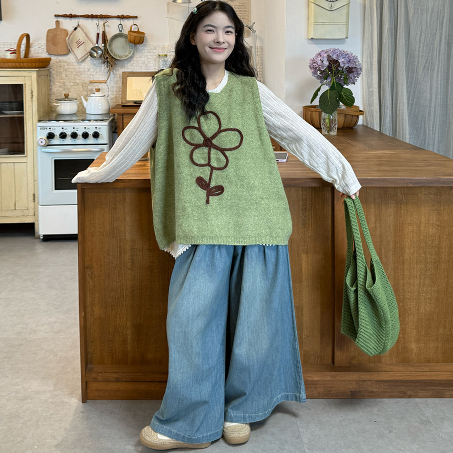 胖mm设计感T恤 2026春新款 花朵毛衣马甲 牛仔裤 大码 显瘦套装 女装