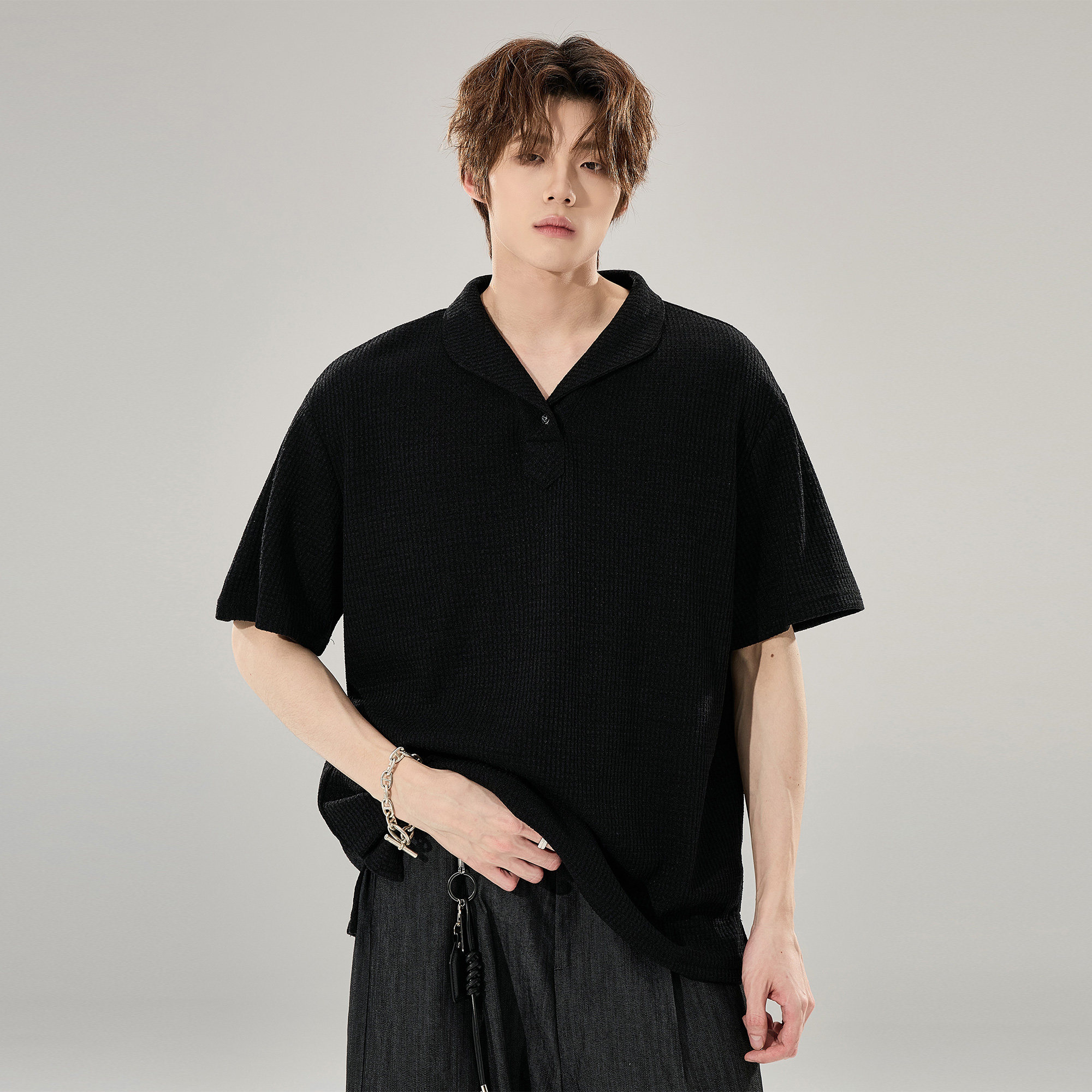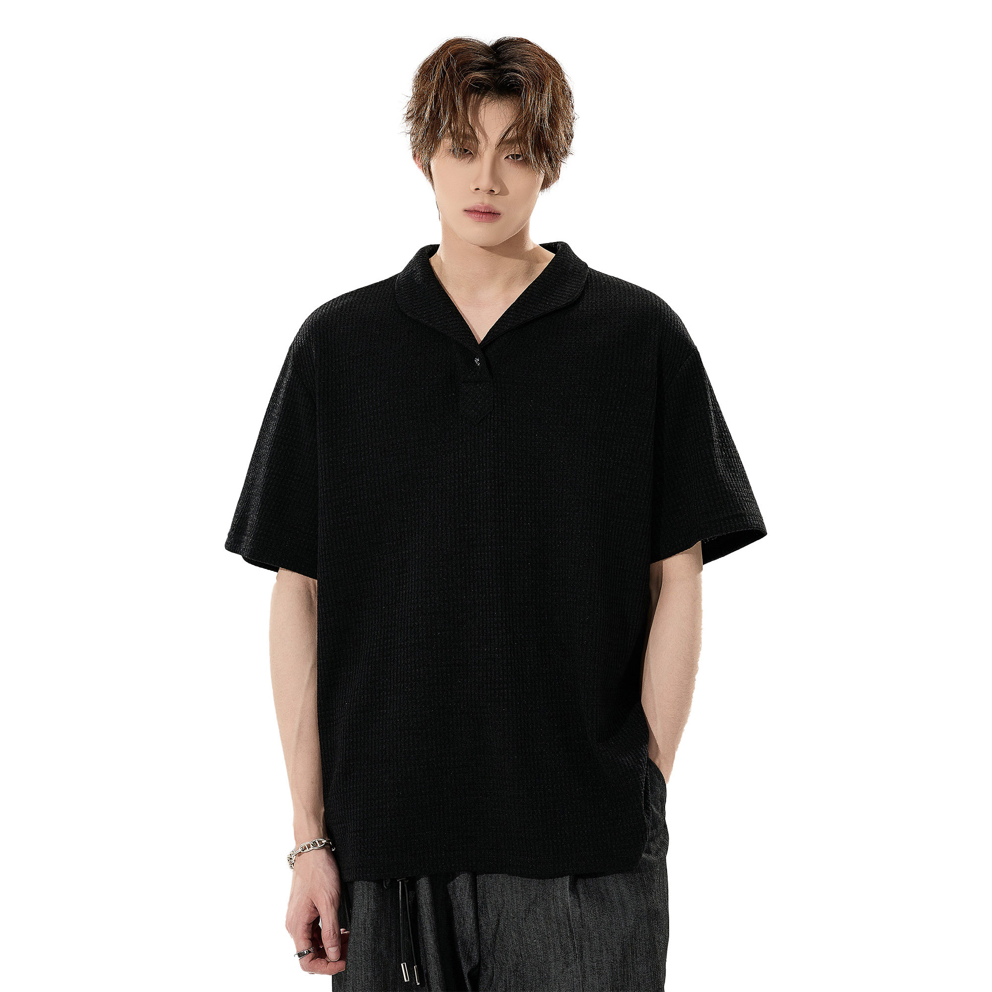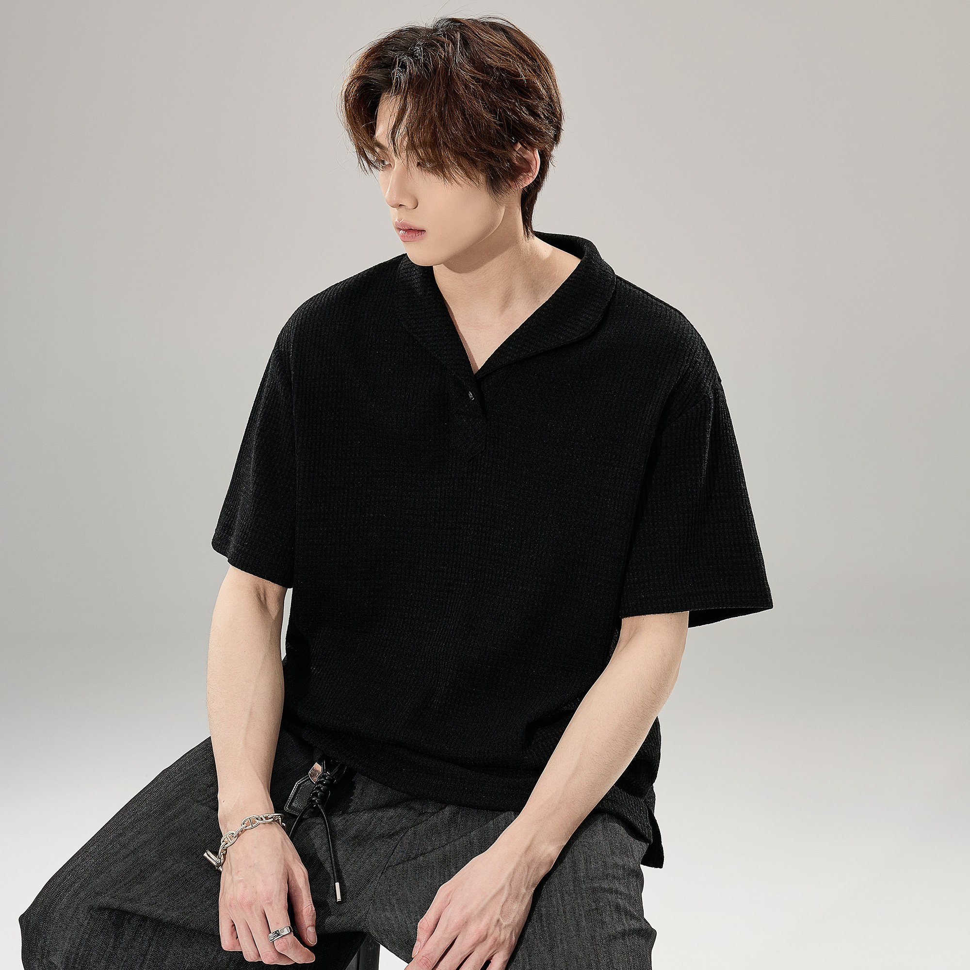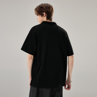 情侣慵懒老钱风透气翻领polo衫 T恤男夏季 上衣 黑色针织短袖 ALLIN