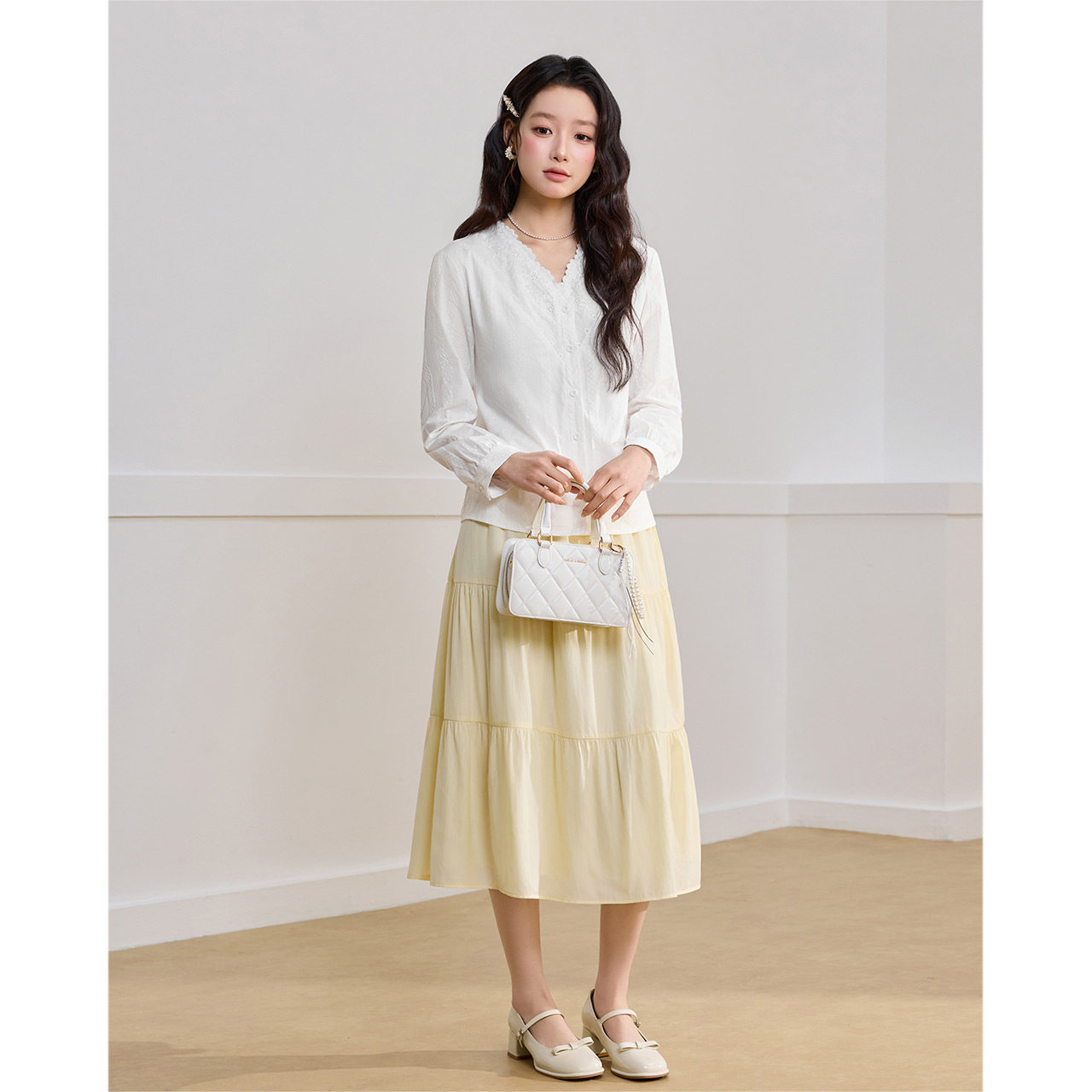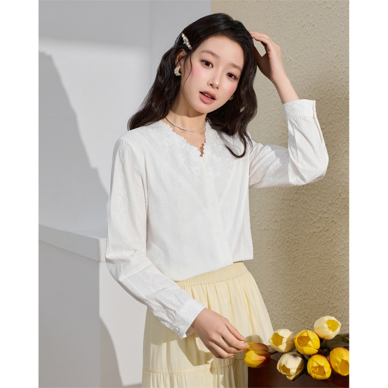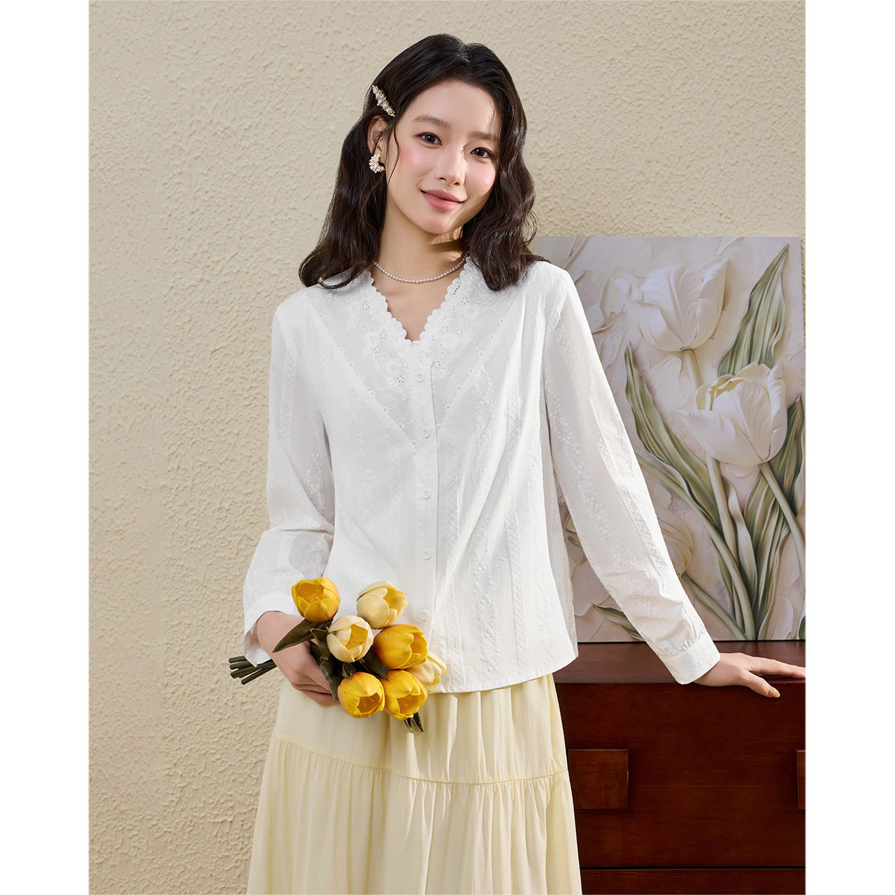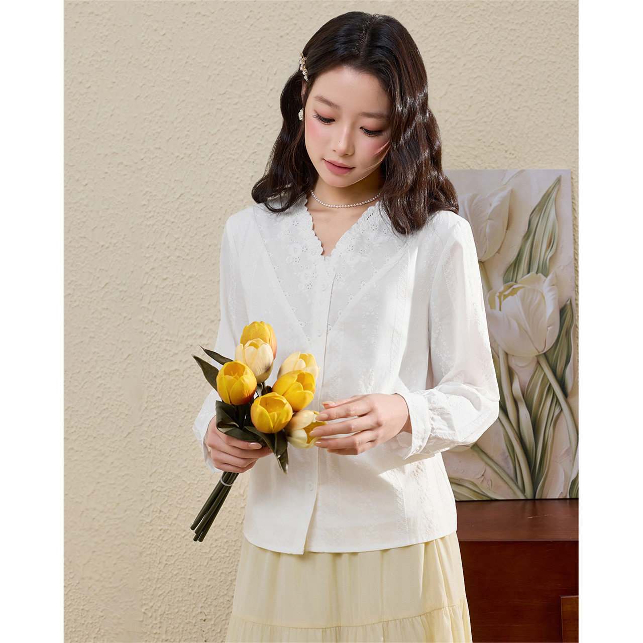 长袖 IEF 2026春韩系温柔风V领白色衬衫 小个子 蕾丝上衣 爱依服