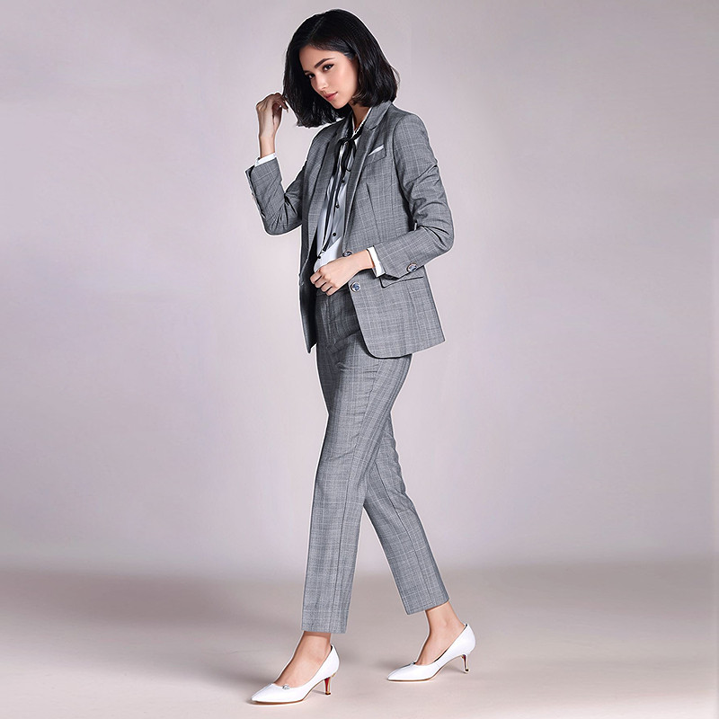 商务通勤面试正装 璐丝百丽灰色格纹西装 职业装 女春季 两件套OL 套装