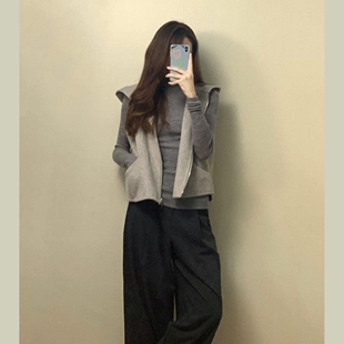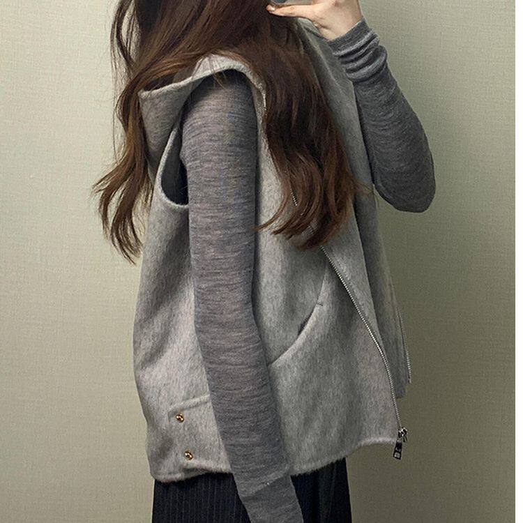 高级宽松百搭无袖 新款 外套 上衣女秋季 550克呢料连帽马甲打底衫