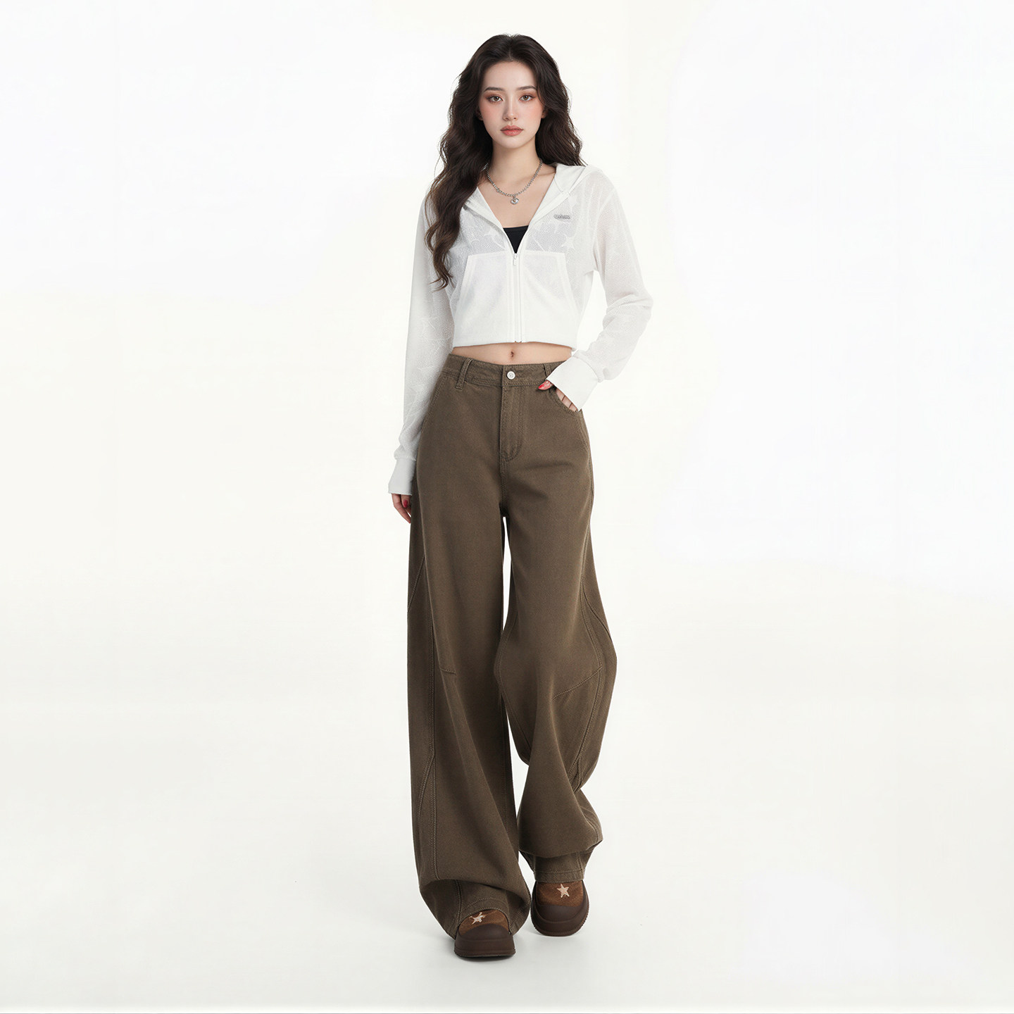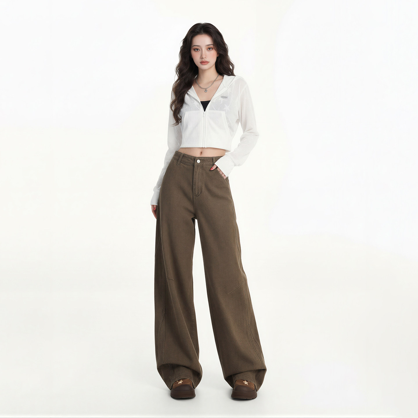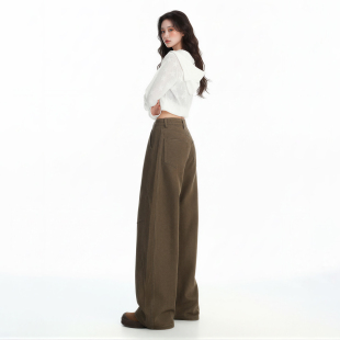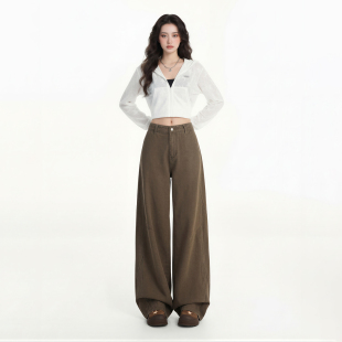 宽松百搭直筒拖地长裤 新款 女2026春季 艾格复古卡其阔腿牛仔裤
