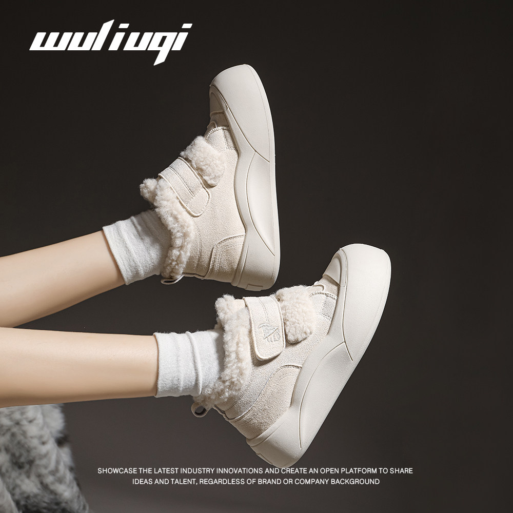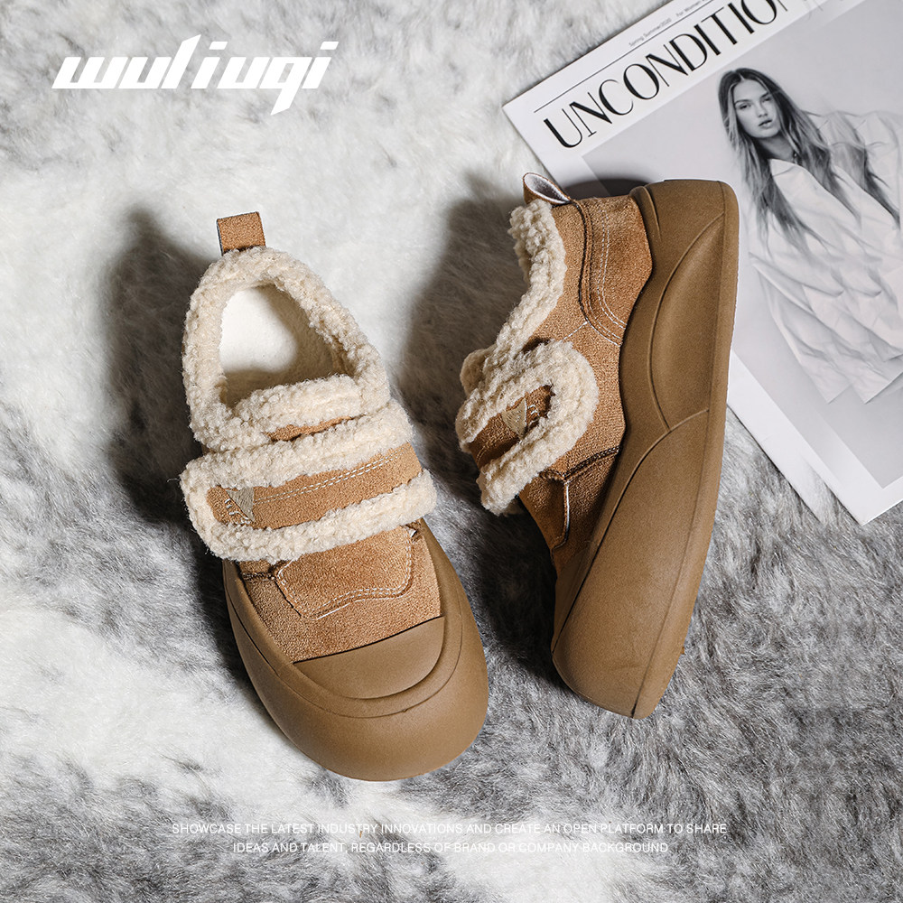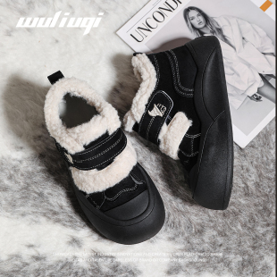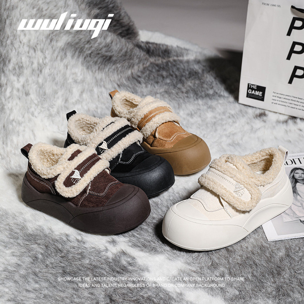 圆头毛毛鞋 巫六七加绒面包鞋 厚底板鞋 魔术贴棉鞋 女2025秋冬新款