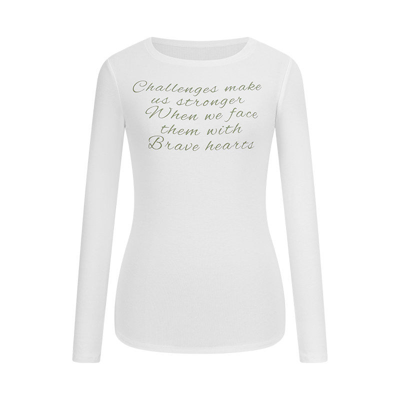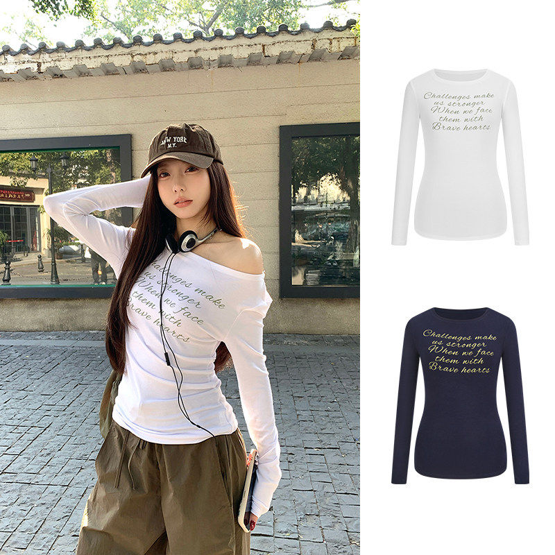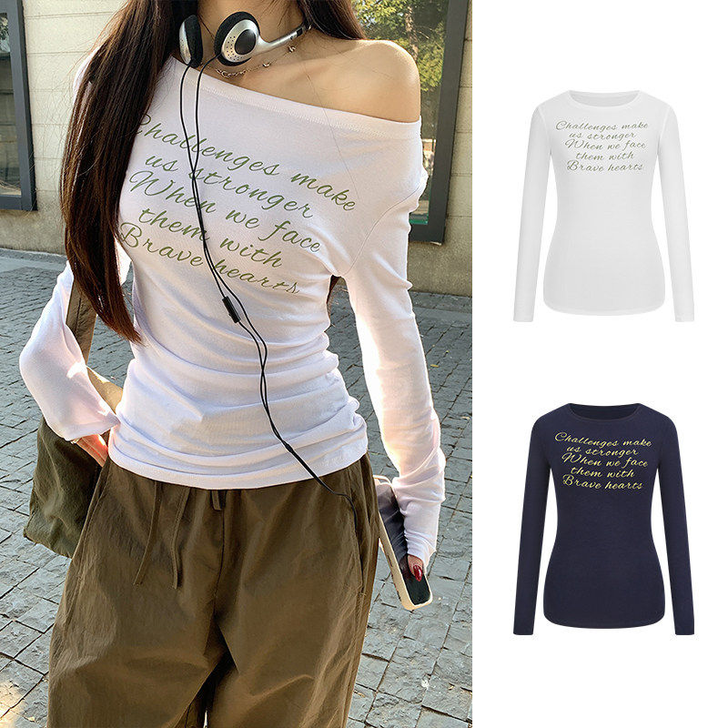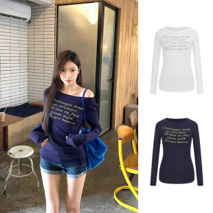 MosesQueen魔西女王字母印花斜肩长袖 上衣 t恤纯欲露肩内搭打底衫