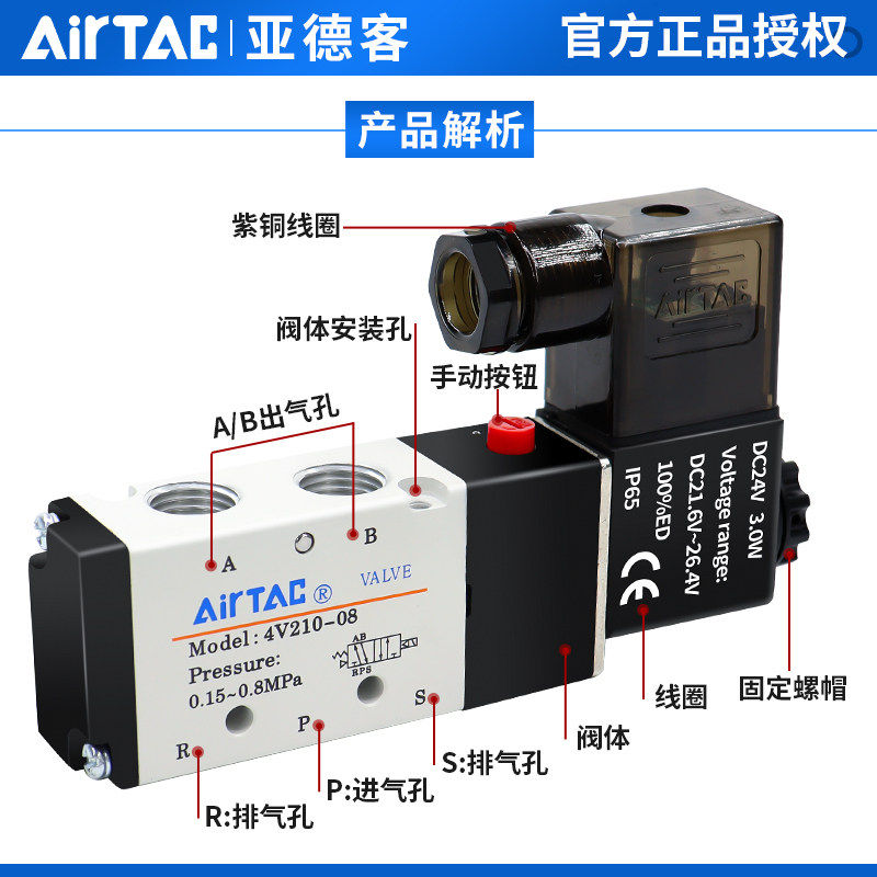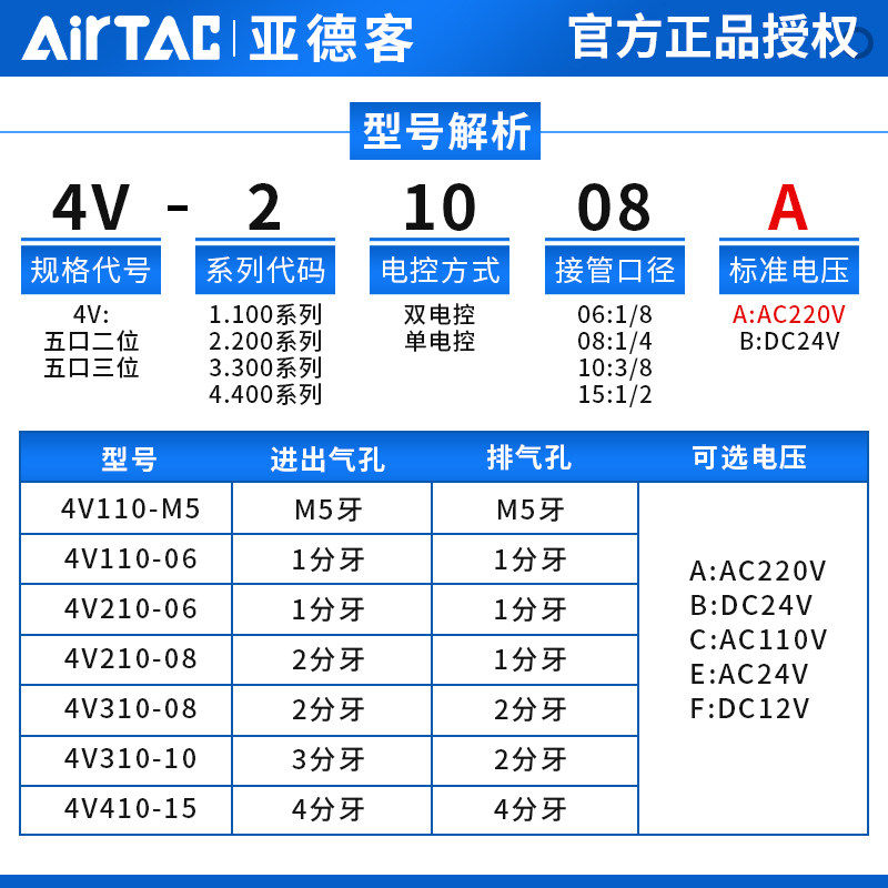 亚德客气动电磁阀4V210一08换向阀220V线圈控制阀24V电子气阀12V