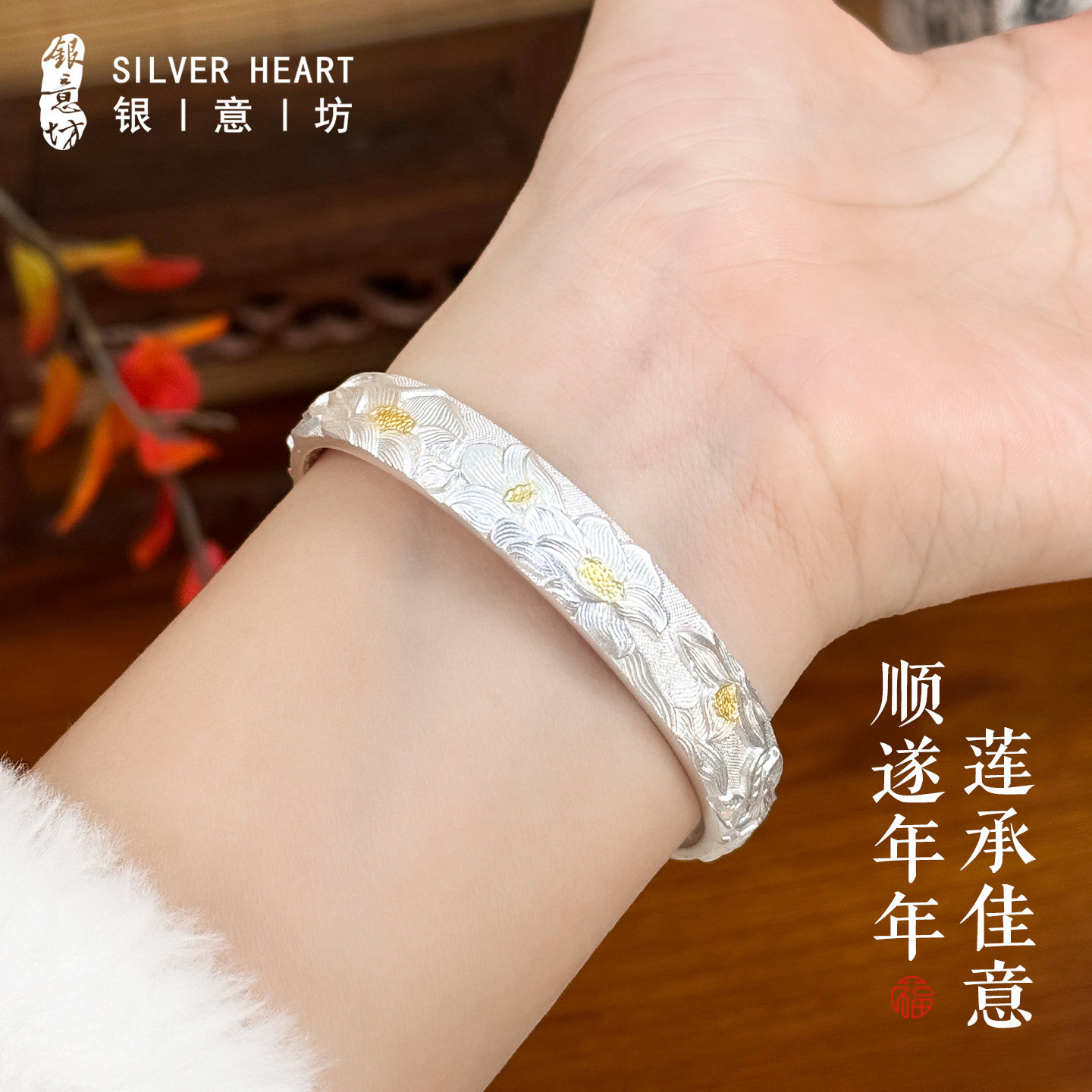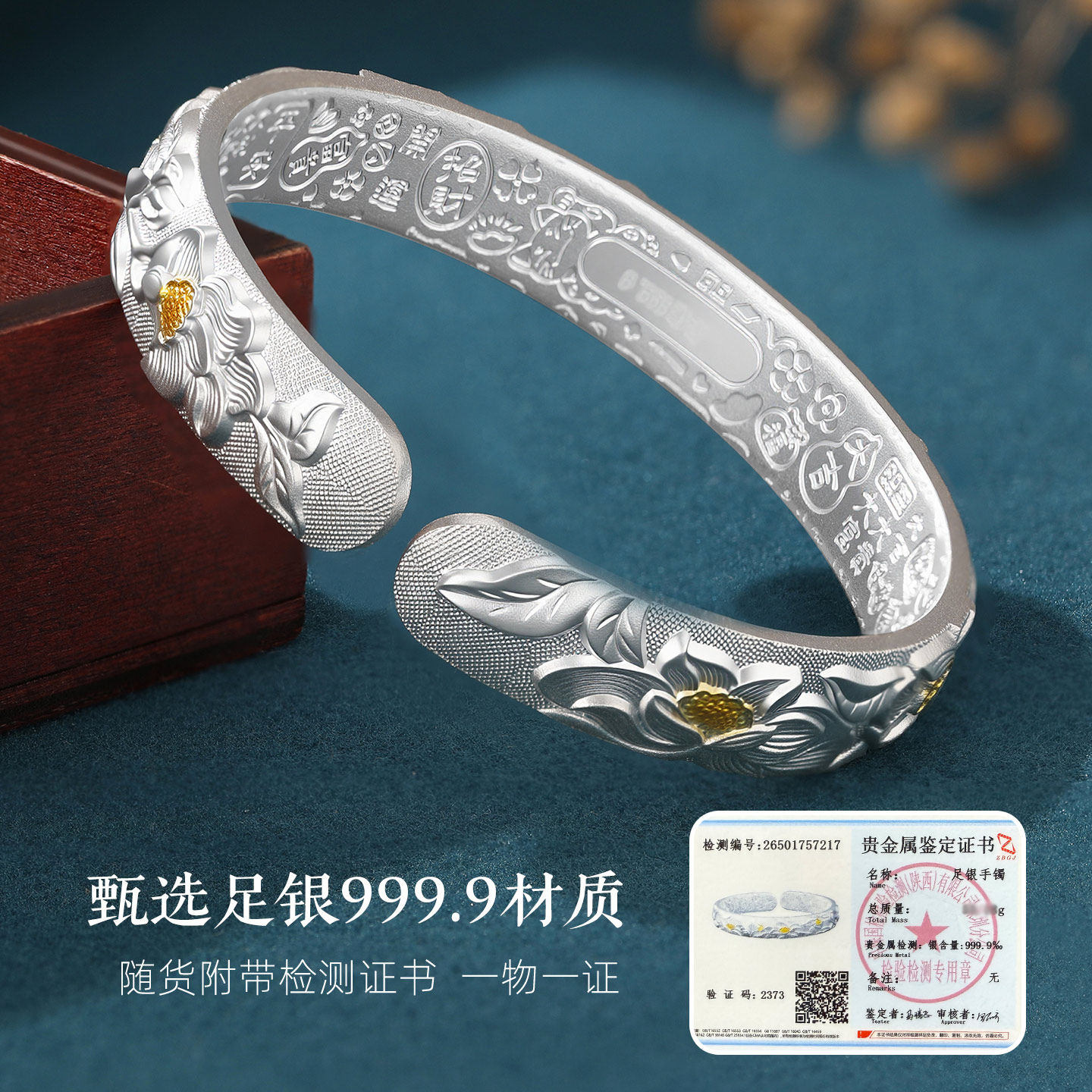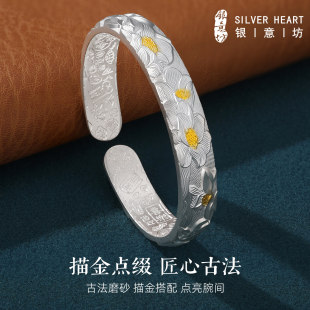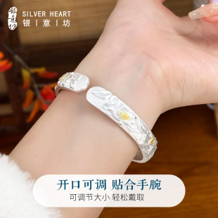 莲花银手镯女9999纯妈妈款 吉言开口古法银镯子送奶奶老人实用礼物