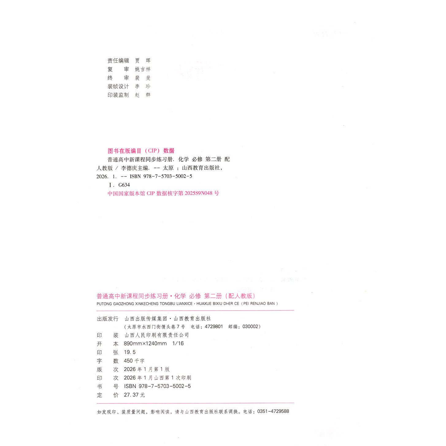 化学 普通高中新课程同步练习册 必修 第二册 内附答案一份 正版 配人教版 2026春季