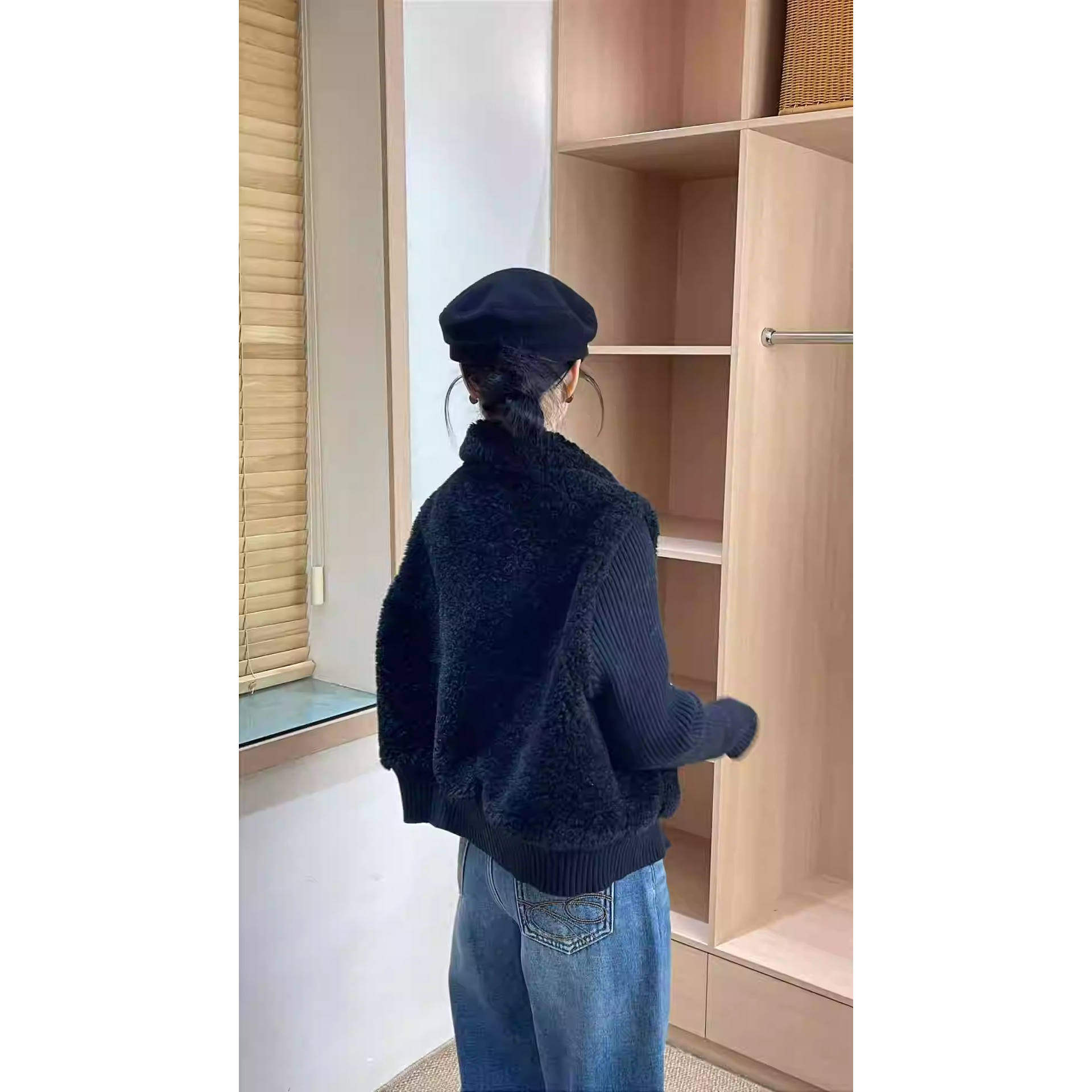 保暖上衣5839 冬季 现货清仓韩系针织袖 假两件羊羔毛翻领短外套女装