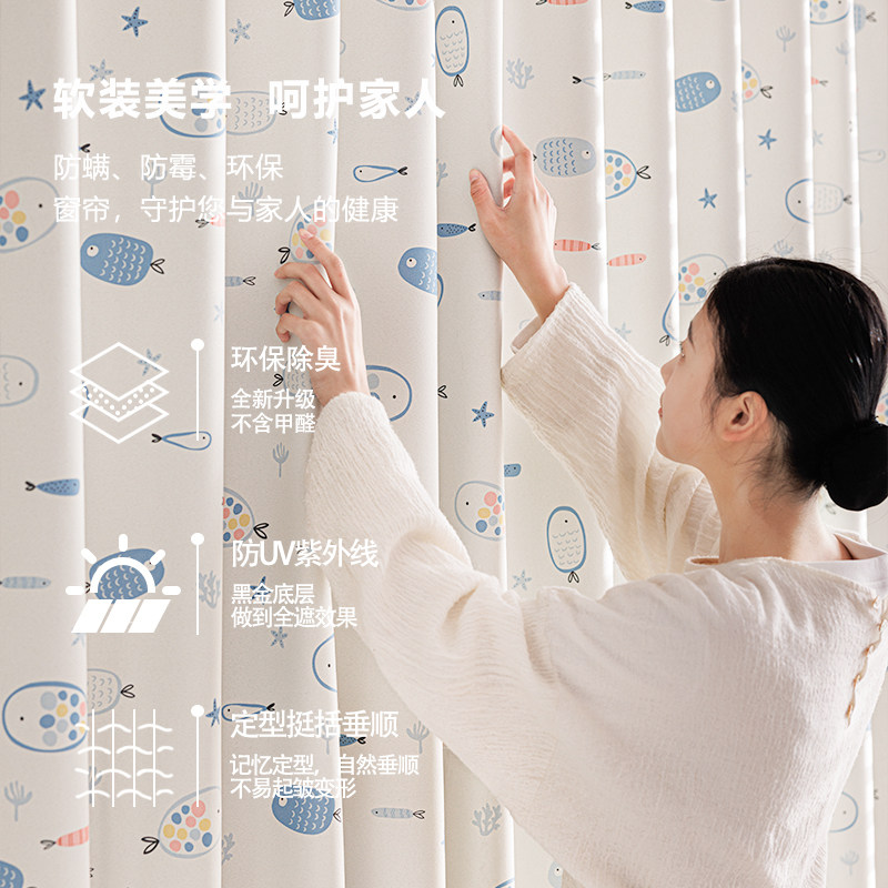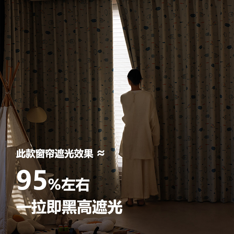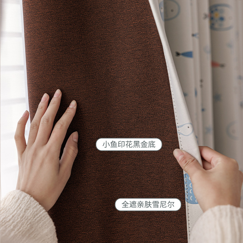 儿童房窗帘蓝色卧室卡通遮光男女孩卧室2026年新款 雪尼尔小鱼印花
