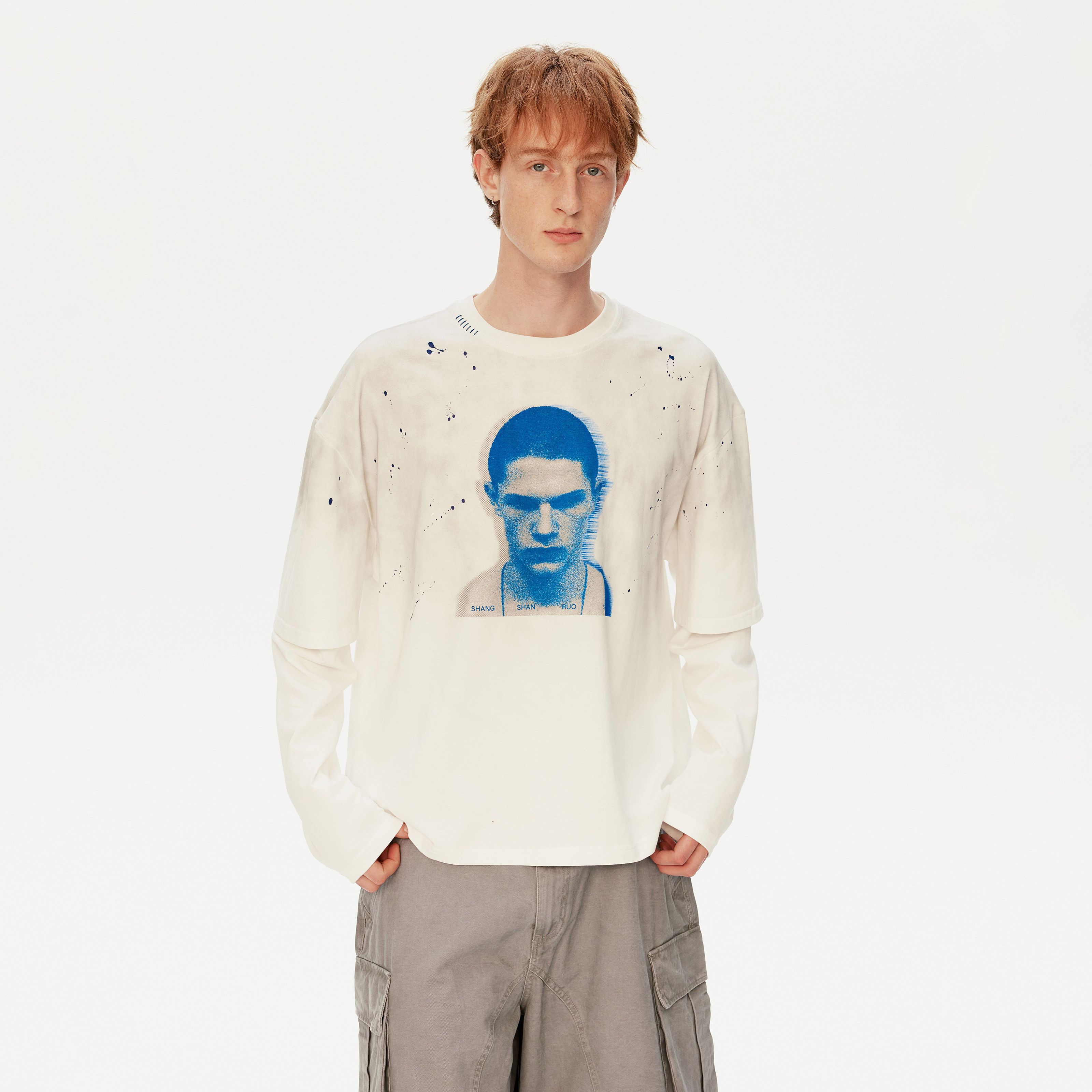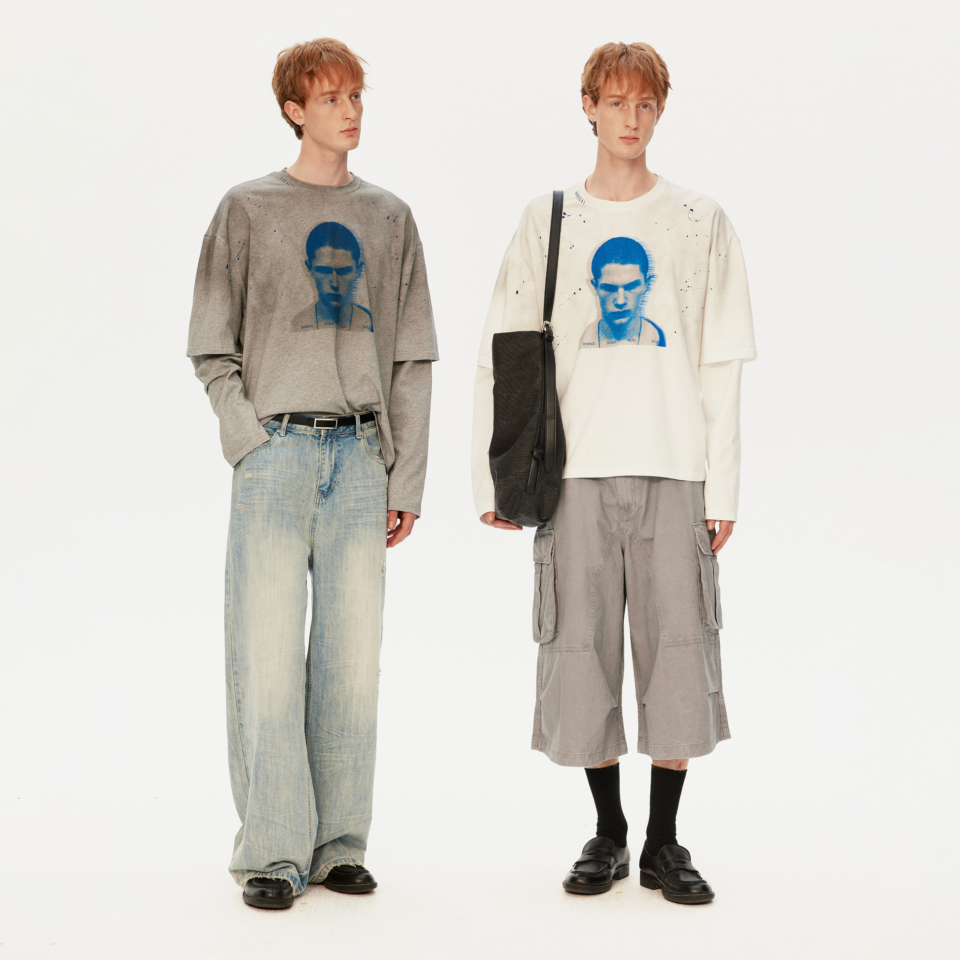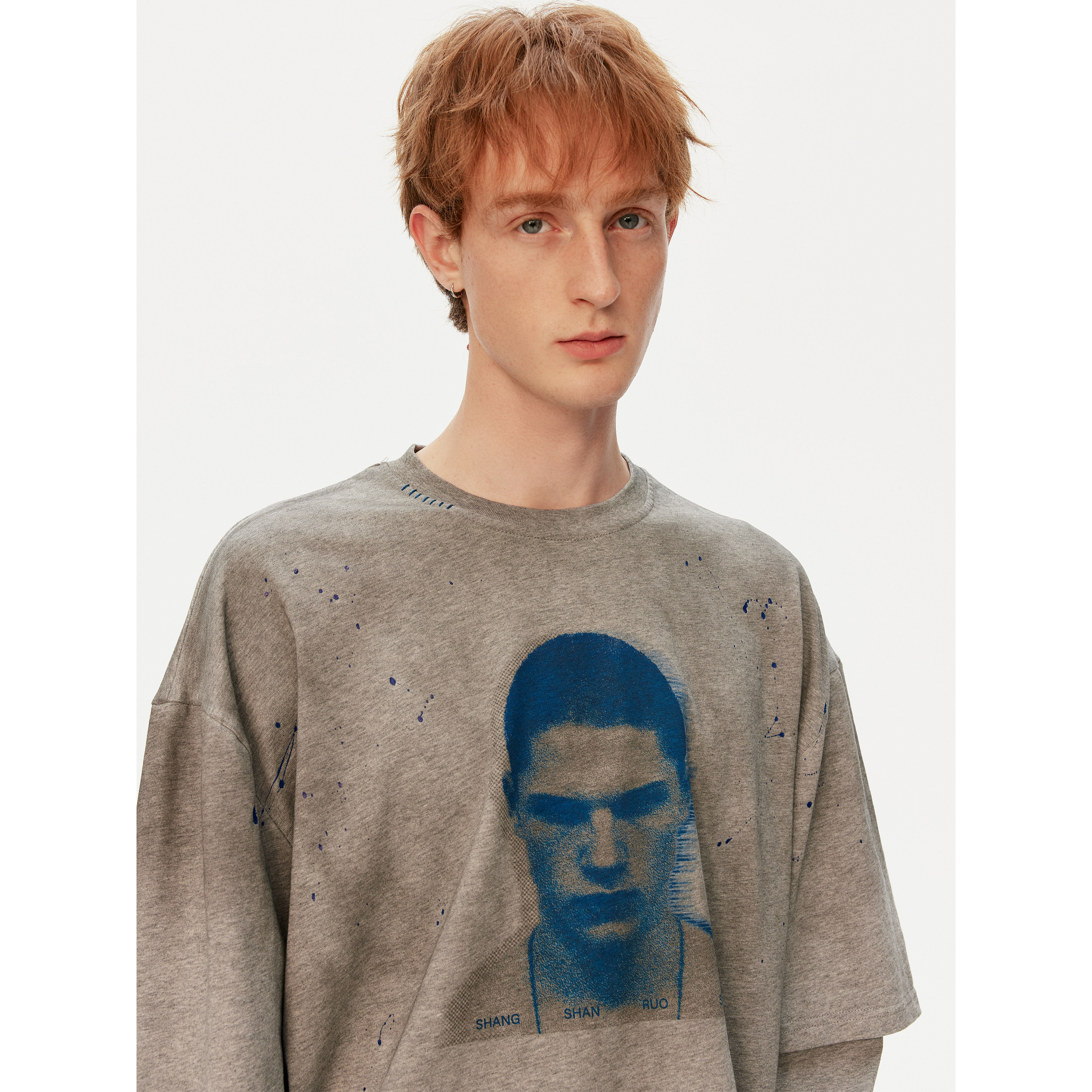 MADWITCH复古做旧喷脏假两件印花T恤男女宽松休闲痞帅高街上衣潮