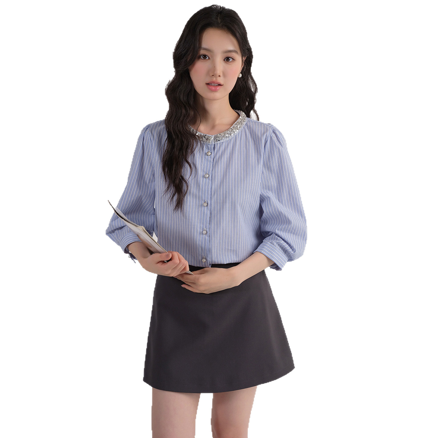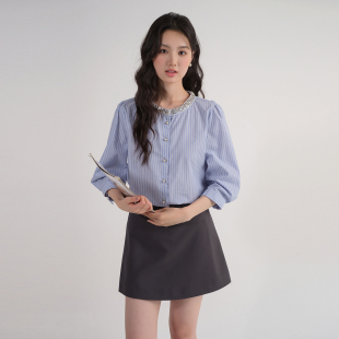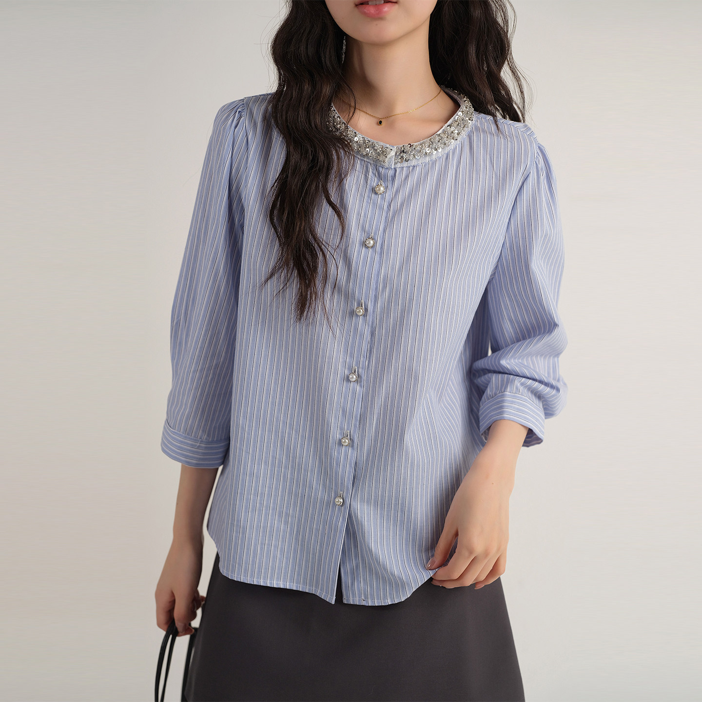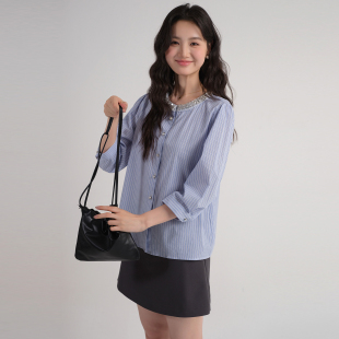 女装 胖MM七分袖 2026夏装 钉珠亮片圆领衬衫 条纹上衣 新款 蓝若水大码