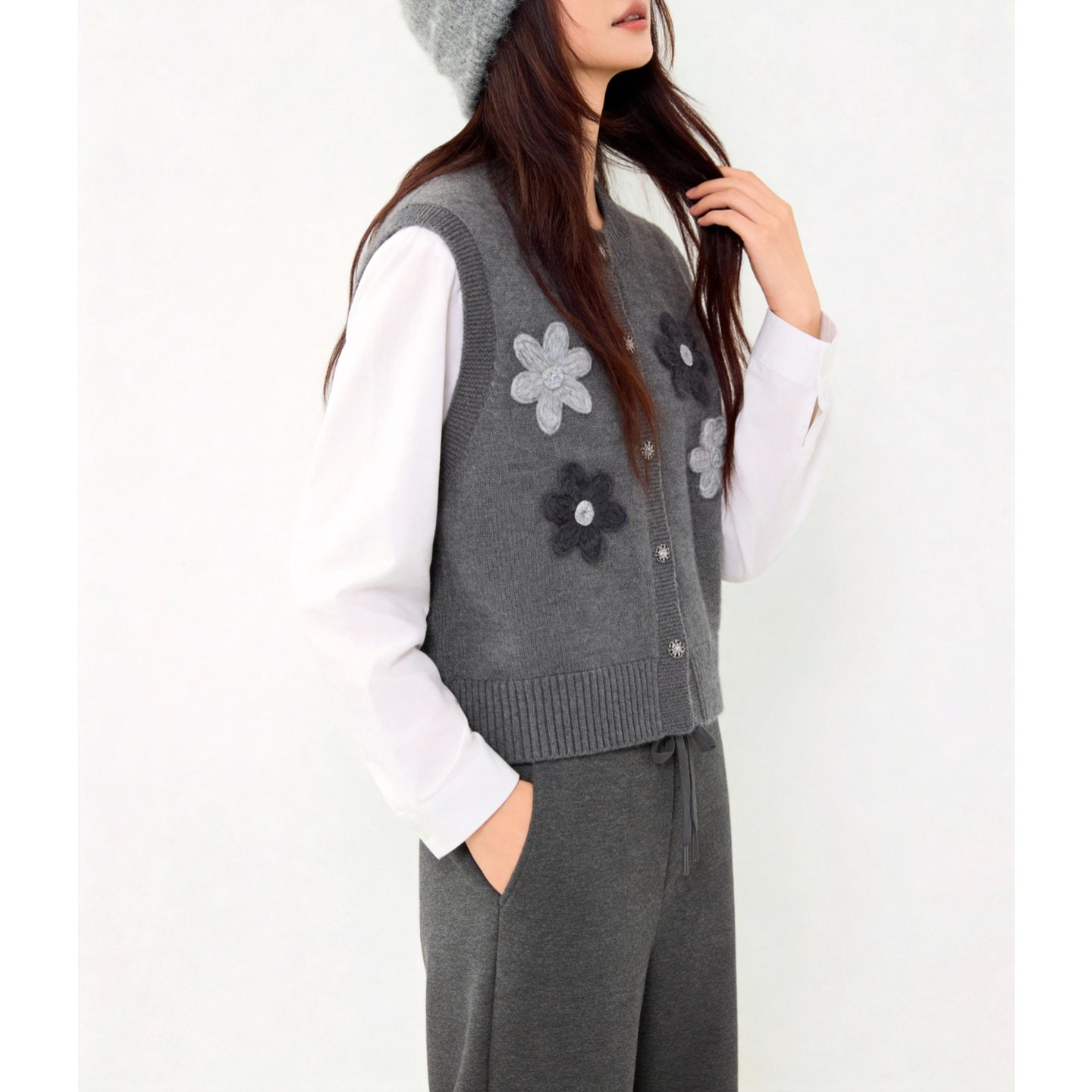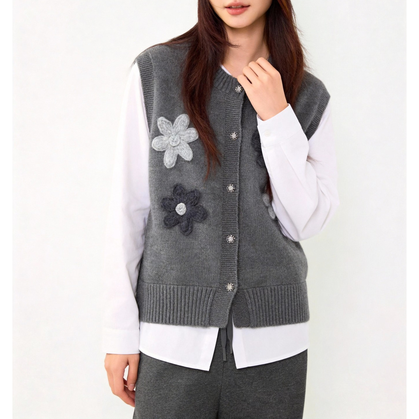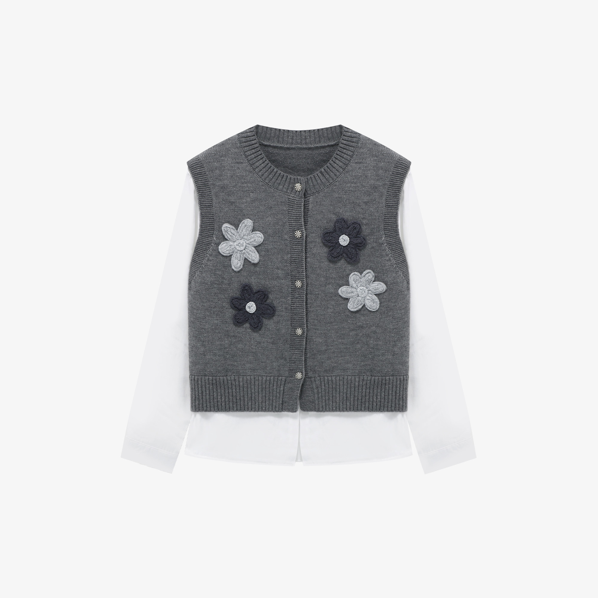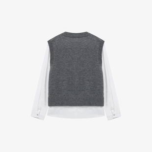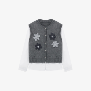 百家好深灰立体花朵贴布假两件上衣针织马甲拼接春季 显瘦百搭毛衣