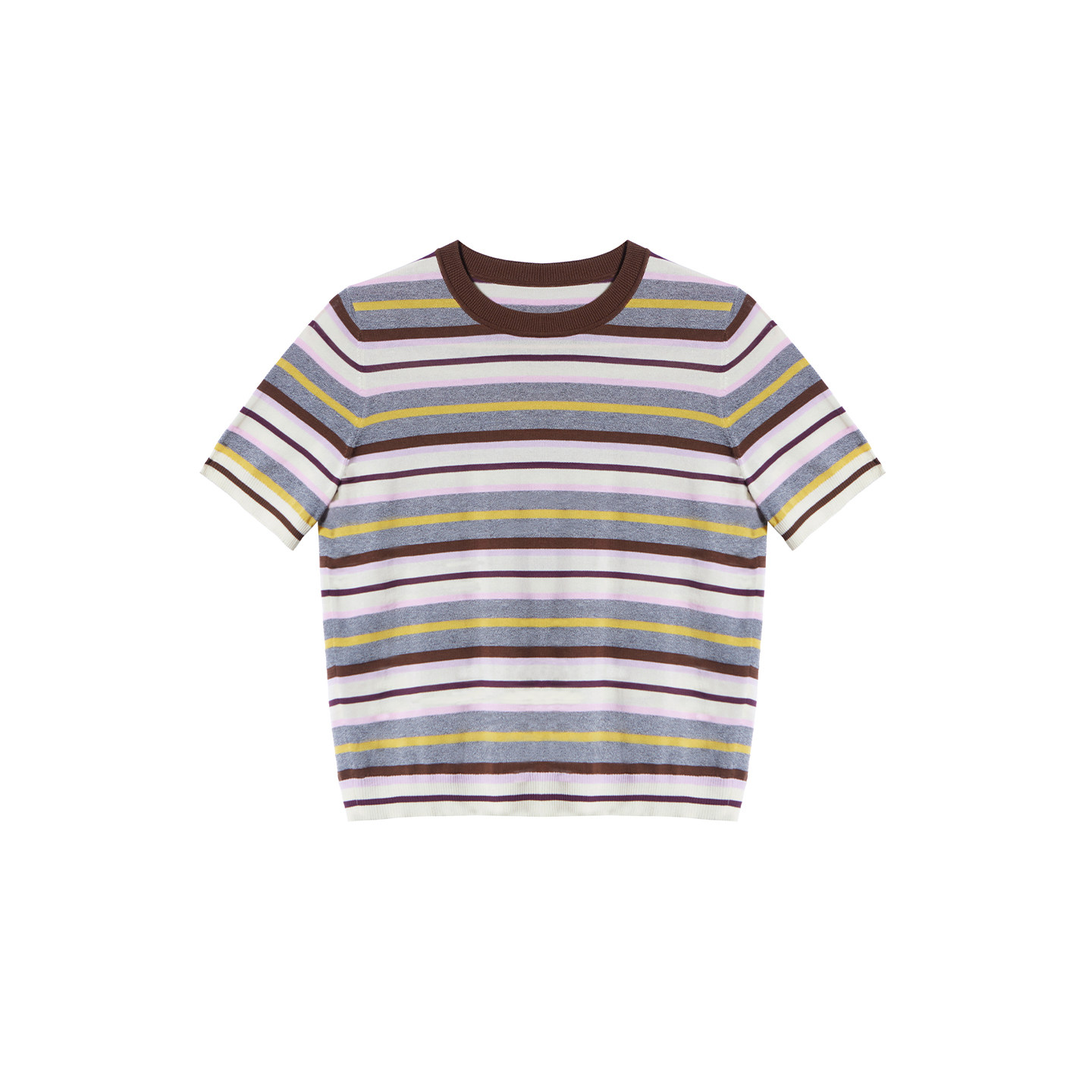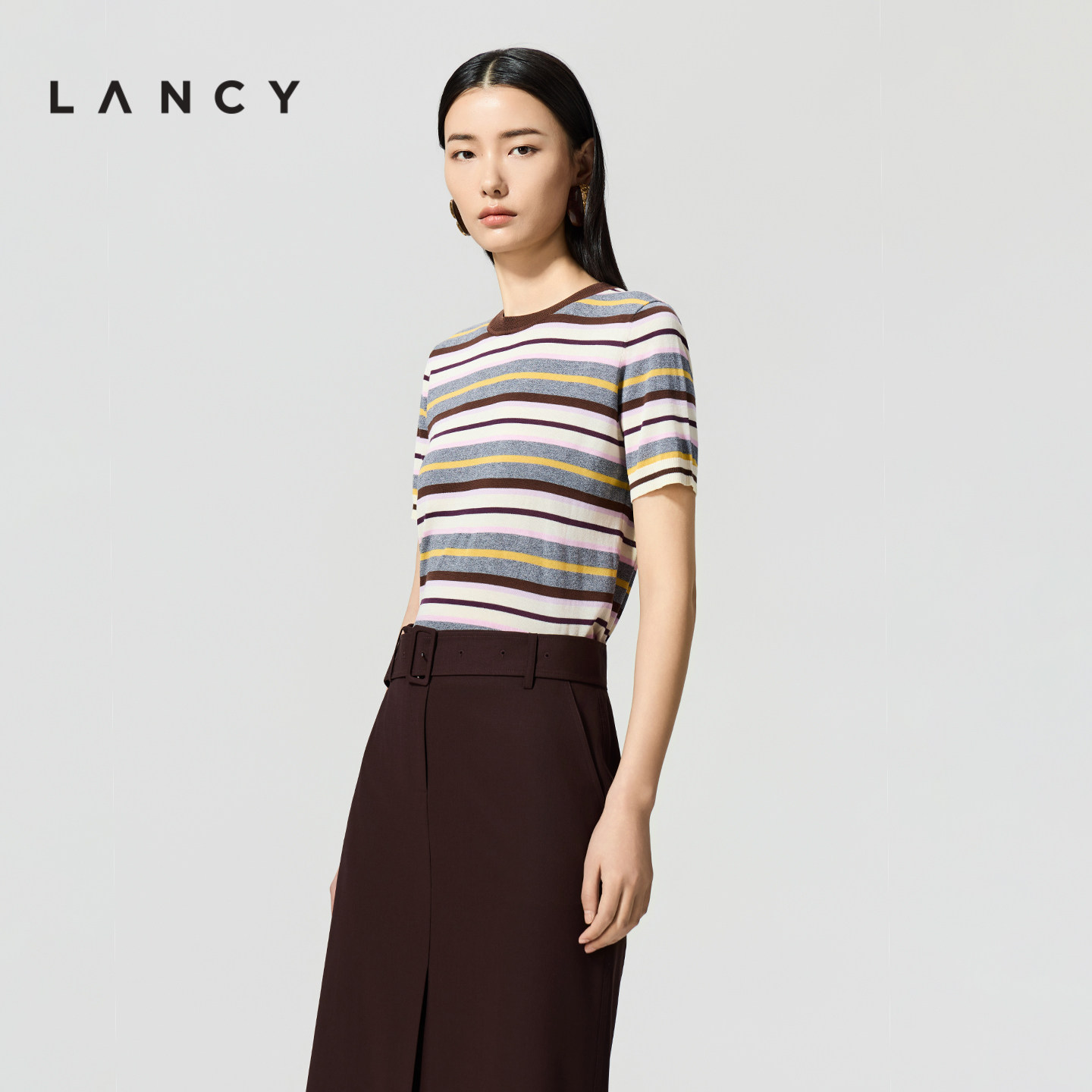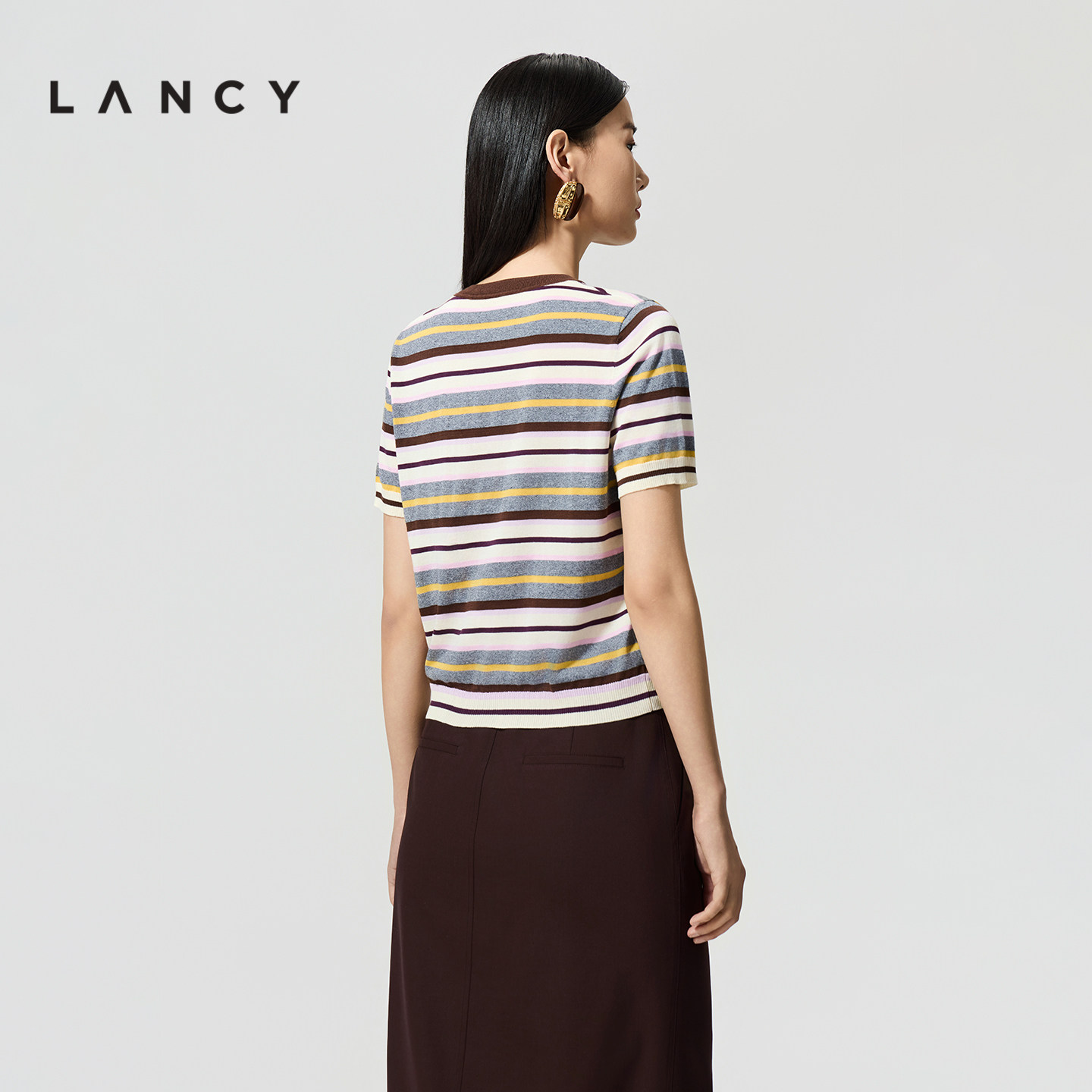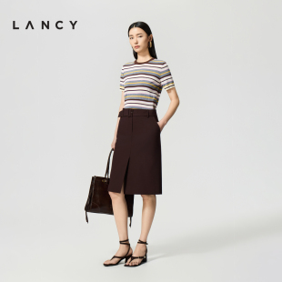 朗姿2026年夏季 针织衫 新款 复古彩色条纹圆领短袖 上衣女 时尚 LANCY