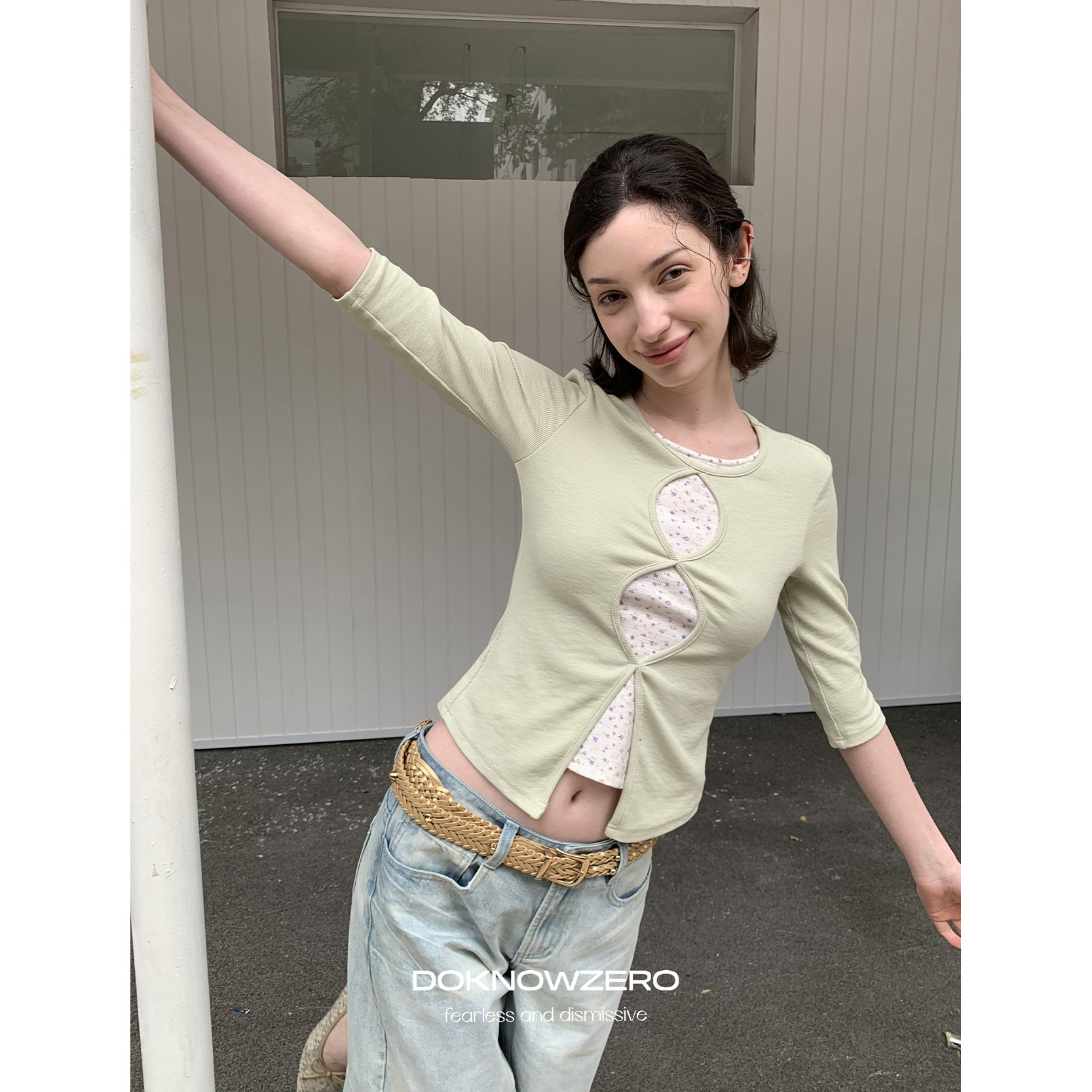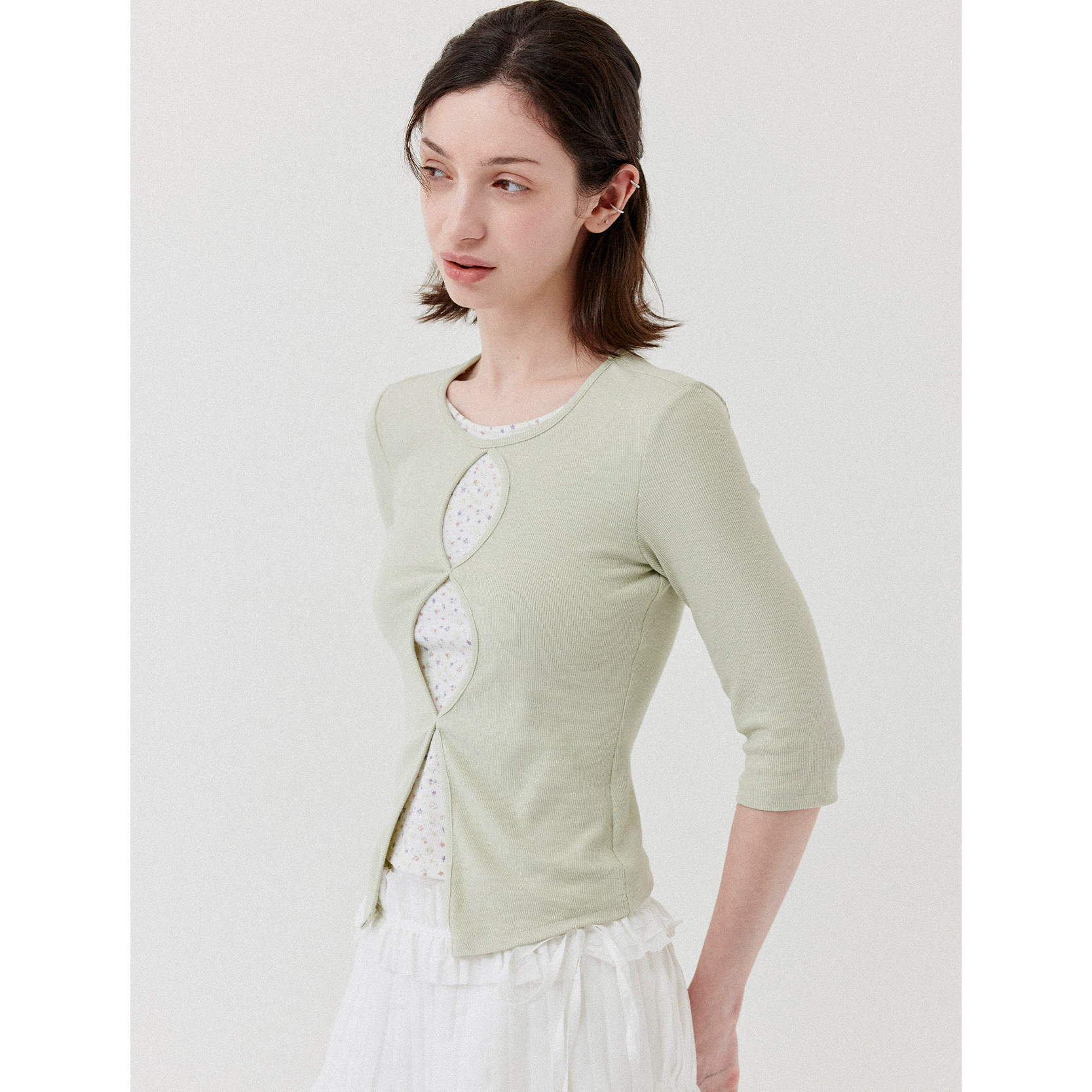 chic感修身 针织t恤女早春新款 假两件上衣 碎花镂空八分袖 DKZ