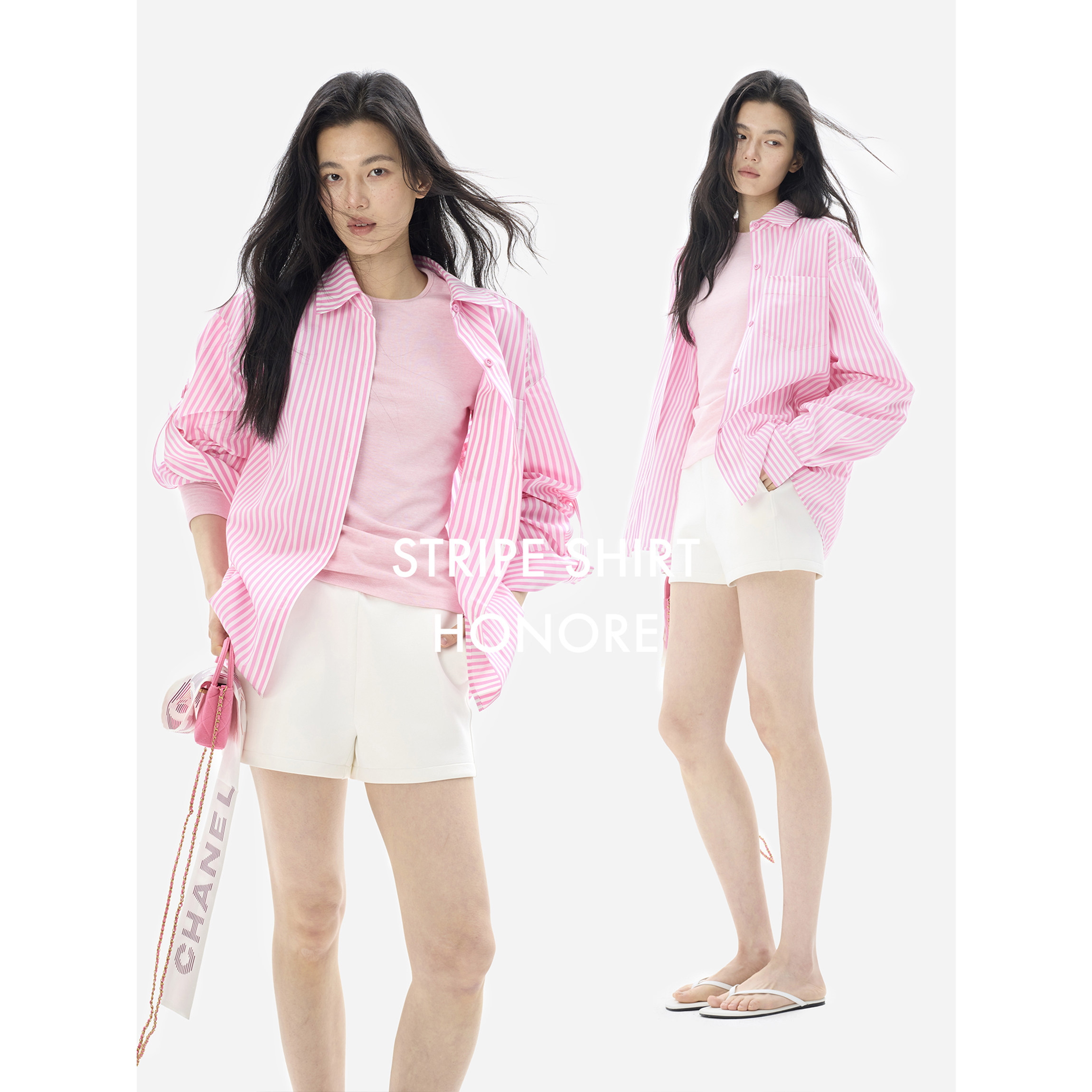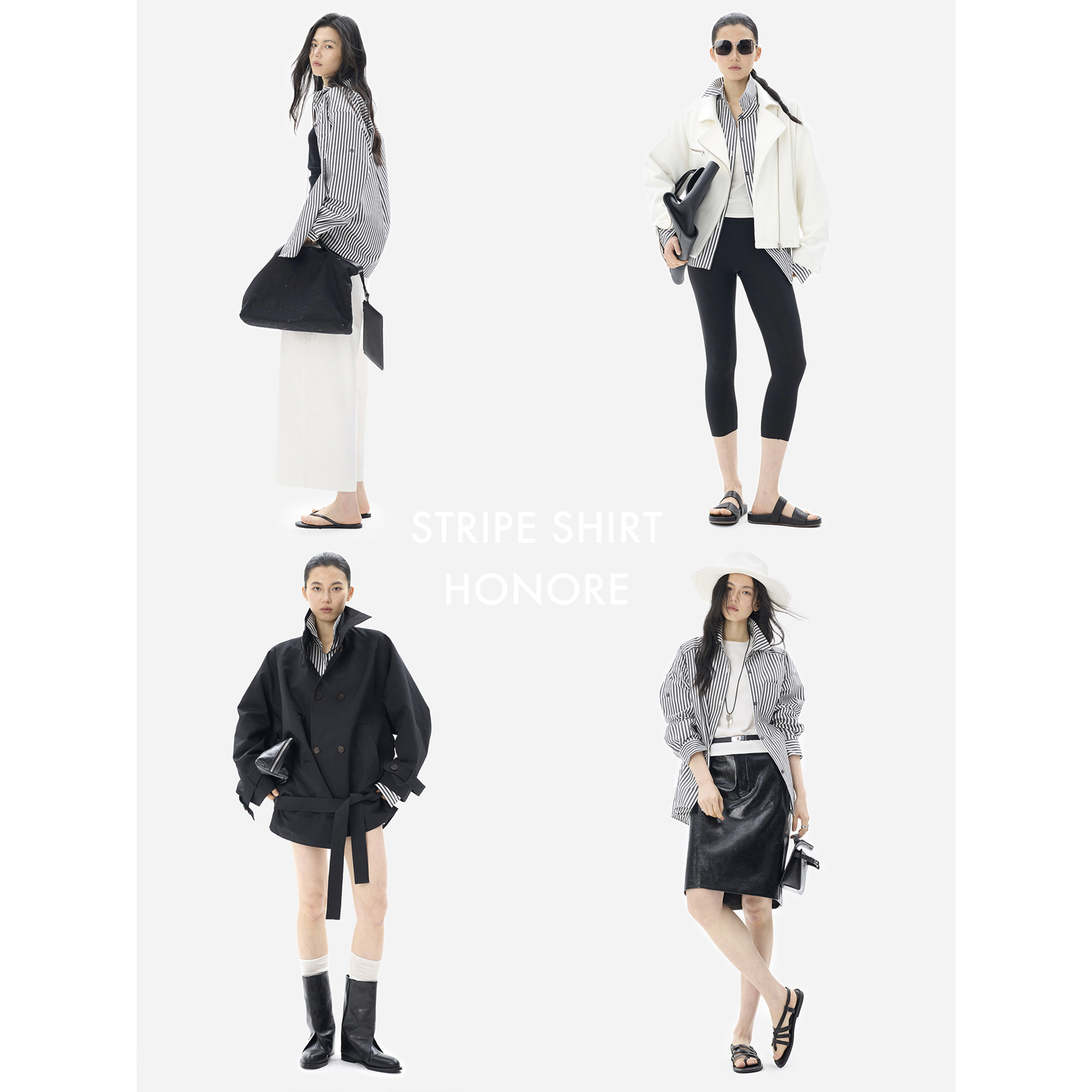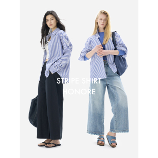 醋酸条纹宽松衬衣圆领百搭长袖 袢宽松剪裁 落肩袖 HONORE古月
